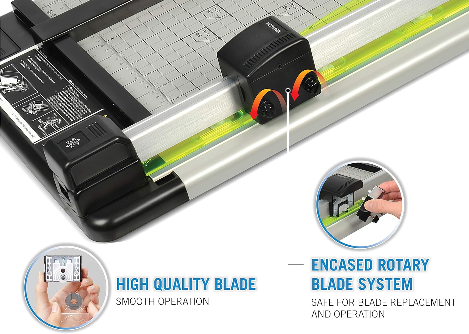 • Heavy-duty 36-sheet rotary trimmer with carbide blade, patented rail system, calibrated metal base board, adjustable magnetic paper guide and storage compartment.