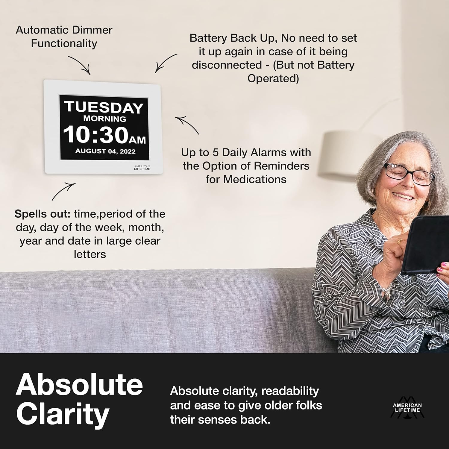 - Customizable alarms: The American Lifetime dementia clock for seniors extra large offers multiple alarm options, allowing individuals to set reminders and up to 5 daily alarms for important events, such as taking medication or appointments.