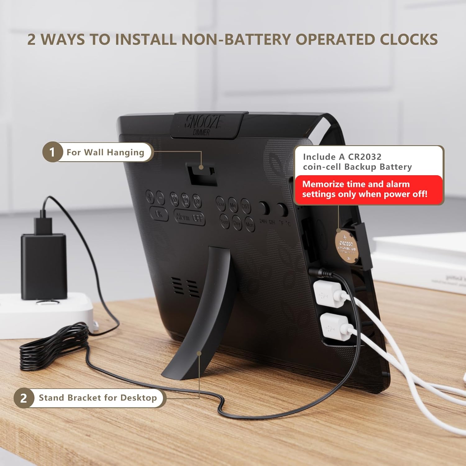 - EASY TO SET - This digital Clock is very easy to set, with 2 USB ports and a snooze function, so you can charge your phone and other electronic devices while you snooze. This alarm clock only supports power cord use, but used with a built-in backup CR2032 coin-cell battery( Before use, PLEASE REMEMBER to REMOVE the Plastic Tab in the Battery Compartment) together will be more reliable, it can backup time and settings in a power surge or blackout.