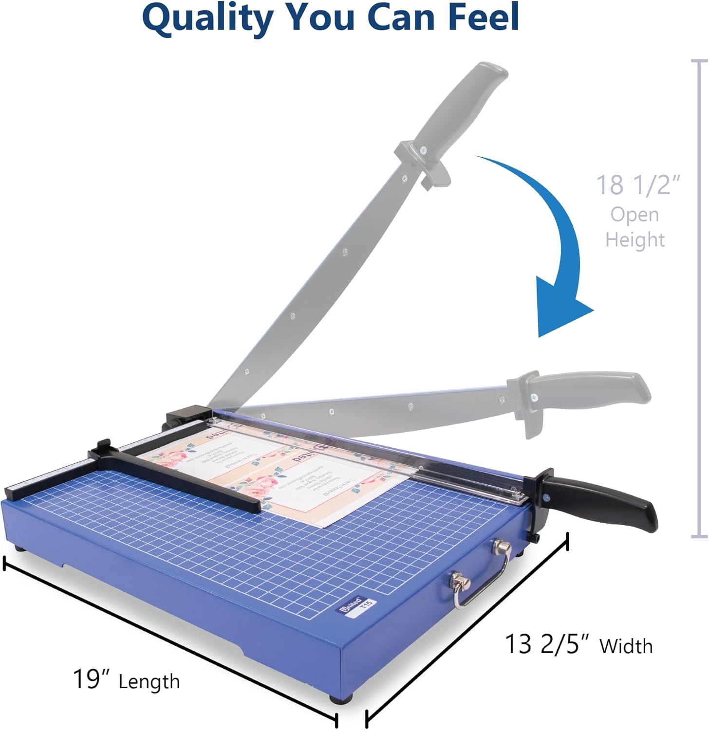 • ENHANCED SAFETY: A full-length safety guard protects hands from the paper slicer blade while holding sheets in place. Use the built-in blade lock to secure the heavy duty paper trimmer blade for safe storage.