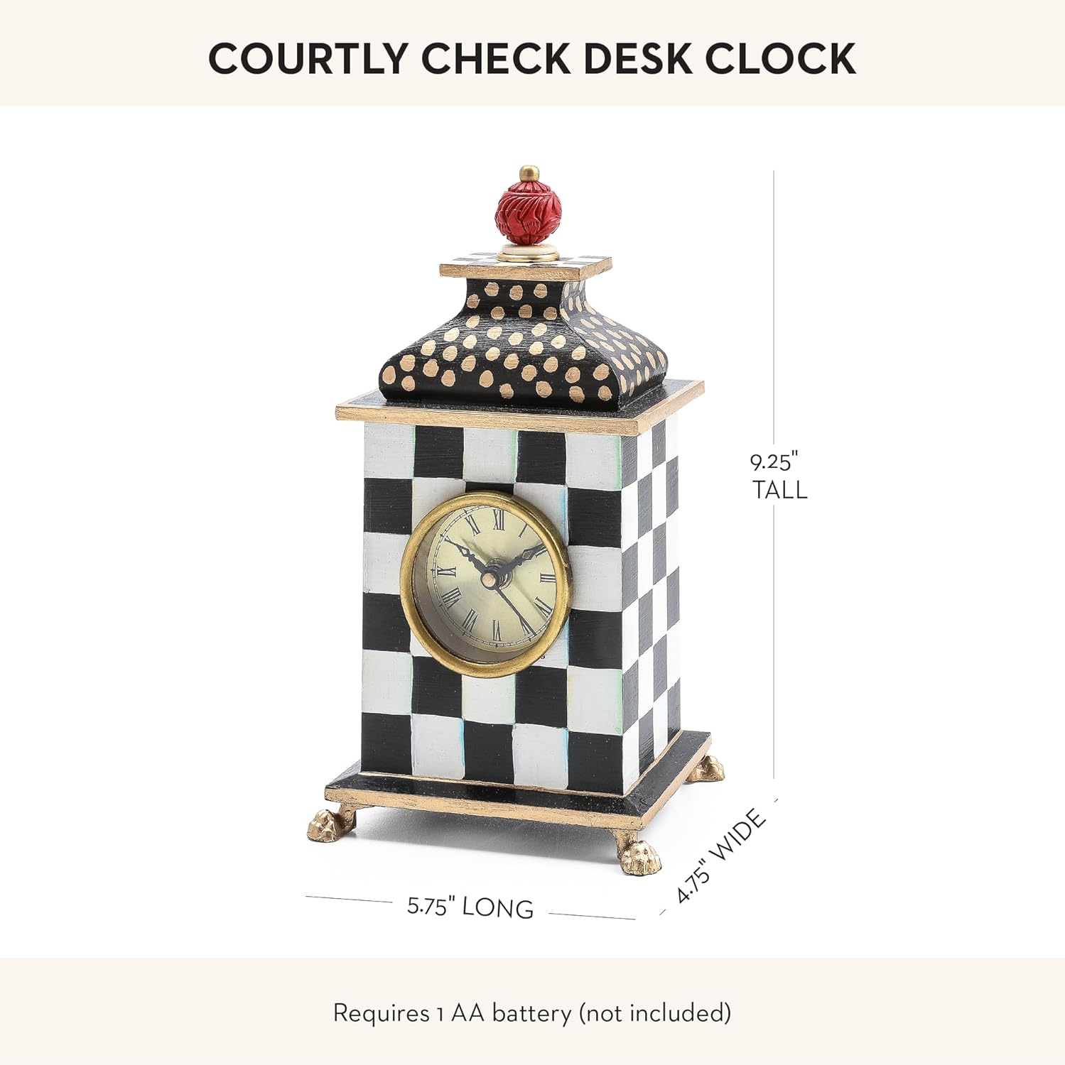 - ELEGANT HOME DECOR: The Courtly Check Desk Clock is an elegant piece of clock decor that will make everyone watch the time. This fancy standing clock features hand-painted wood, brass accents, and black-and-white checks and is topped with gold dots.