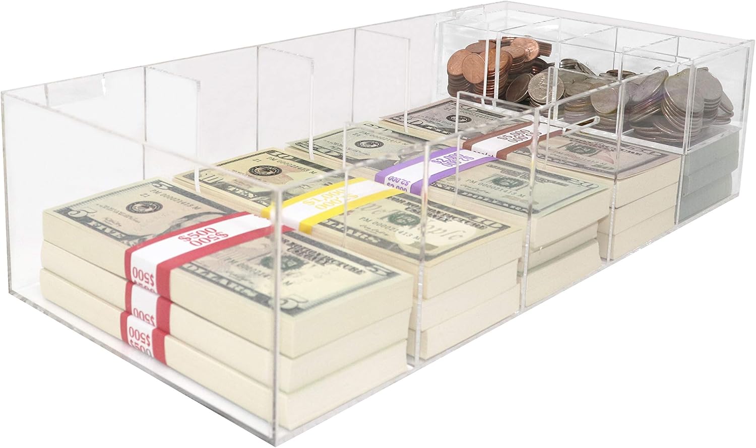 Acrylic Money Tray with Coin Tray Insert, 5 Compartment Clear Cash Organizer Currency Money Storage Box, 300 Money Wrappers Included
