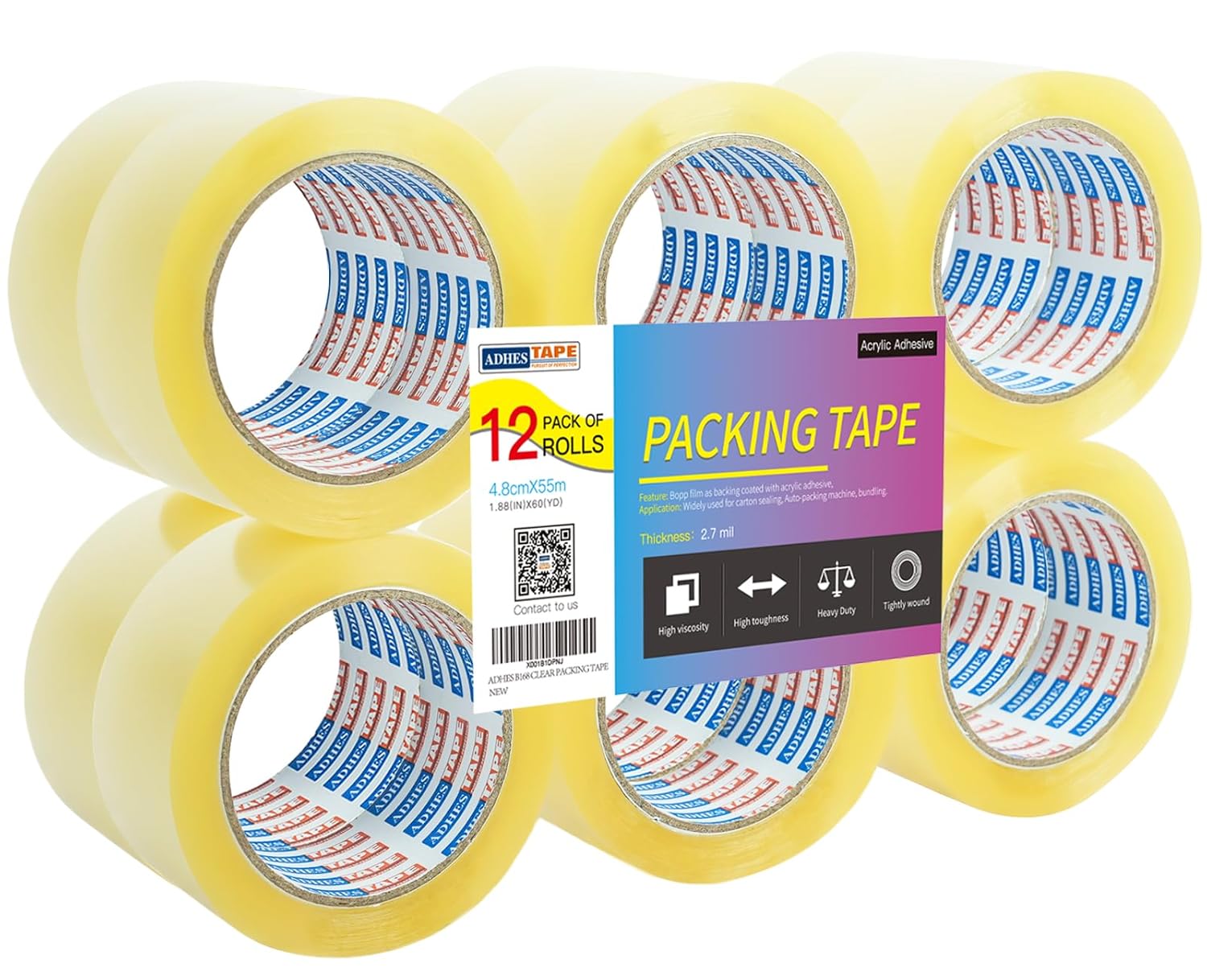 ADHES Packing Tape, 12 Rolls 1.88 inch x 60 Yards Clear Duct Tape 2.7Mil Heavy Duty Shipping Tape for Moving Boxes, Shipping, Mailing