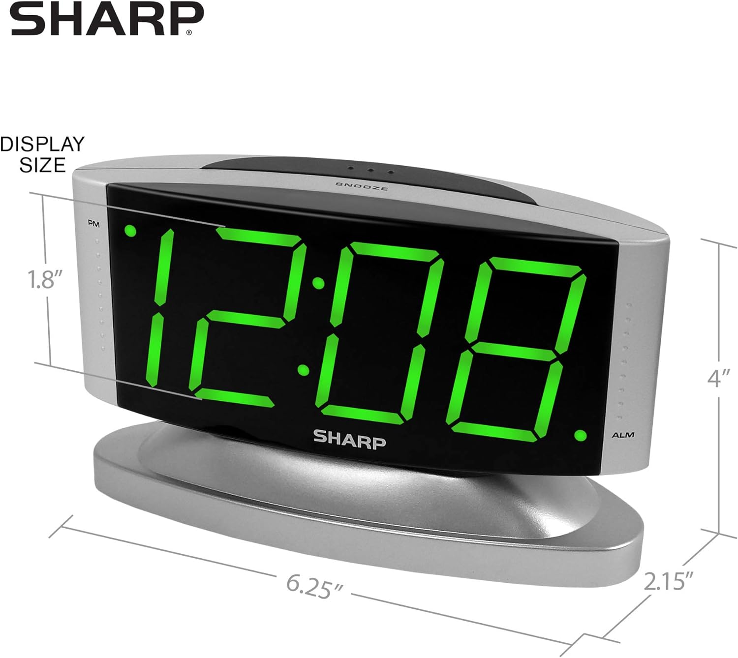 Sharp Home LED Digital Alarm Clock – Swivel Base - Outlet Powered, Simple Operation, Alarm, Snooze, Brightness Dimmer, Big Green Digit Display, Silver Case