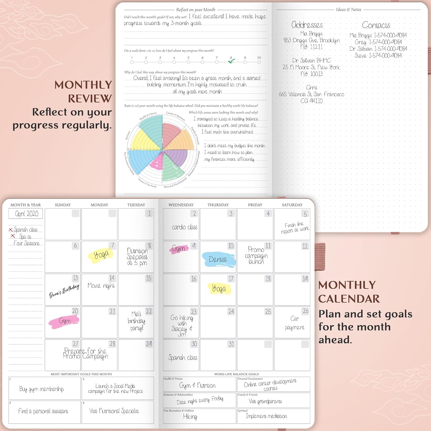 • IMPROVE WORK-LIFE BALANCE & REFLECT REGULARLY – This life planner prompts you to plan monthly activities in 6 life areas and reflect on your progress regularly to see where your life might be lacking.