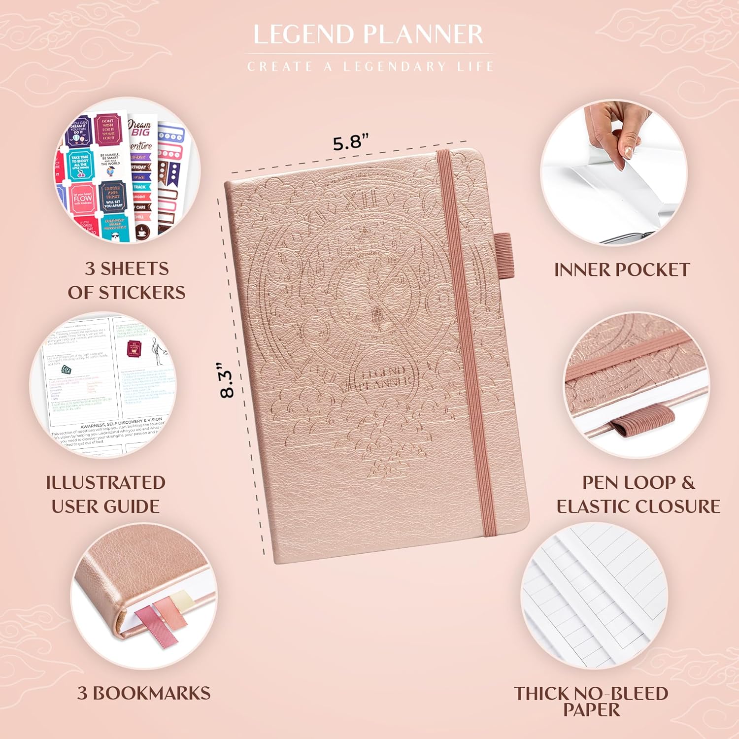 • UNDATED PAGES, A5 FORMAT & STICKERS – This daily planner measures 5.8 x 8.3 inches, has undated pages, eco-leather hardcover, thick 120gsm paper, lay-flat binding, pen loop, elastic, 3 bookmarks, planning stickers, and user guide.