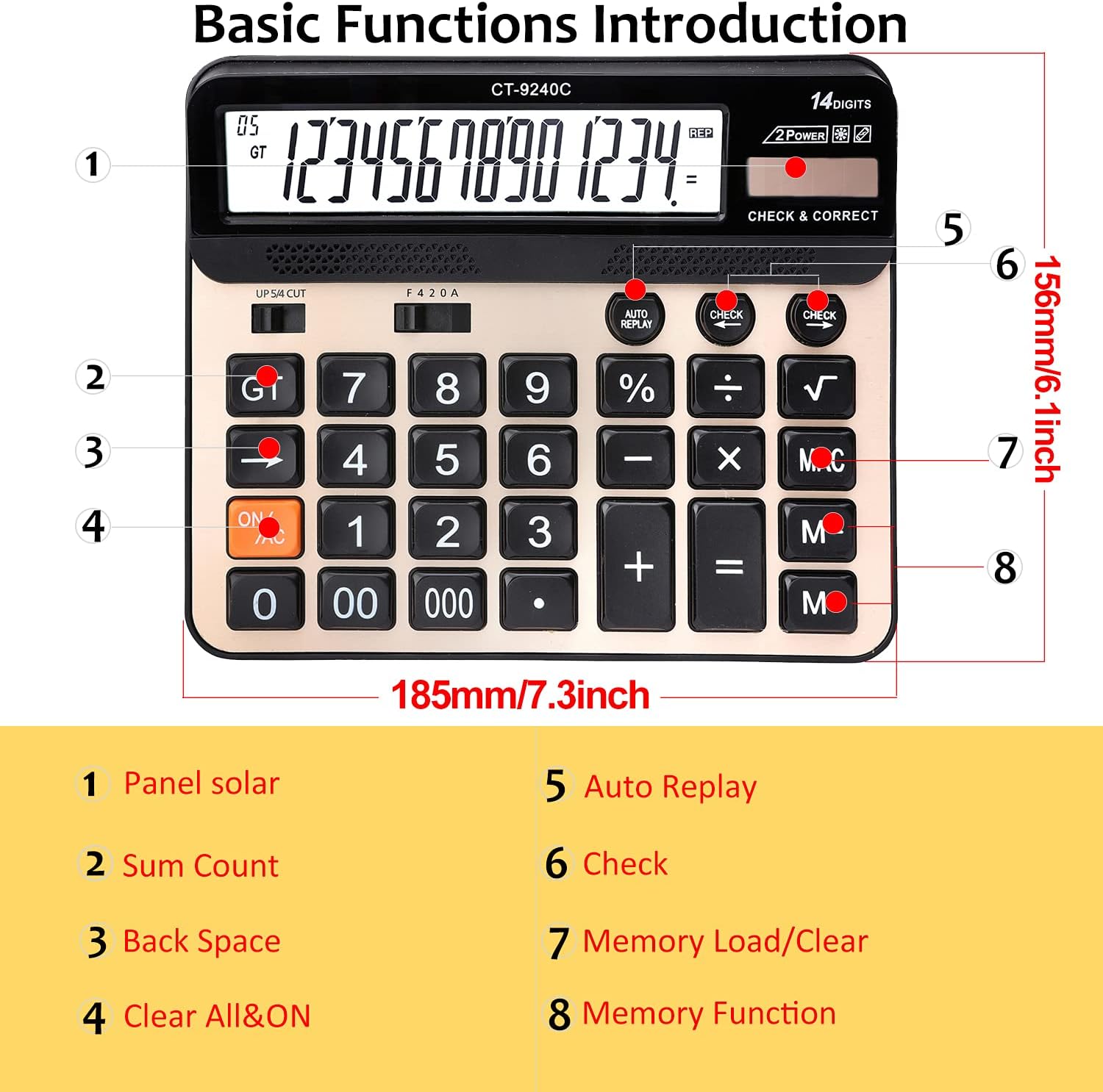 - 【LARGE DISPLAY AND BIG BUTTON CALCULATOR】 Large 5 Inch and clear 14 digits display screen allows for easy readability and usage, relieving any strain on your eyes.Especially suitable for accountants, supermarket cashier,stockbroker and office etc.