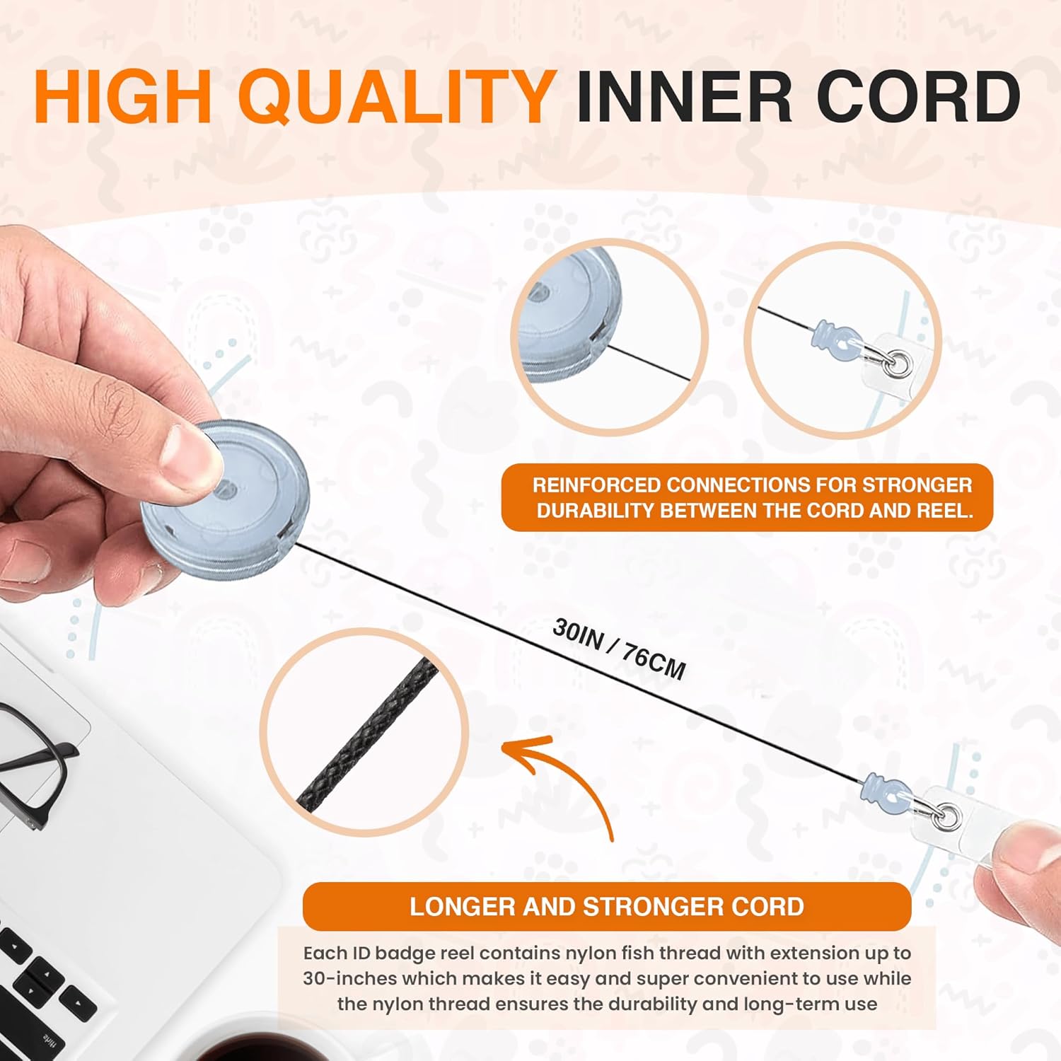 - 【TOP QUALITY BADGE REEL】: Our retractable badge clip is made of high-quality ABS shell and high-strength nylon fish thread of badge clip with 30-inch extension makes retractable badge reel easier to use your ID card. The spring at the joint of id retractable badge holder can reduce the tension and effectively prevents the cord from breaking. All above advantages make it durable