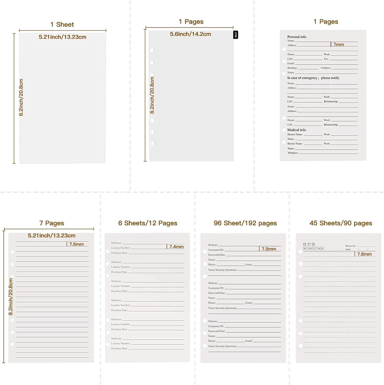 • Vintage Leather Password Notebook :6.7"W x 9.25"H x1"Thick, high-quality antique brown leatherette hardcover, 192 pages off-white paper allows 576 entries for records of website, username/ID, password/hint, name, phone, email, security questions/notes., 12 pages/72 records of Software, license number, purchase date. 6 lined pages for important things to remember, 1 page for emergency information, 12 film laminating durable dividers with alphabetical tabs for easy scrolling of your search.
