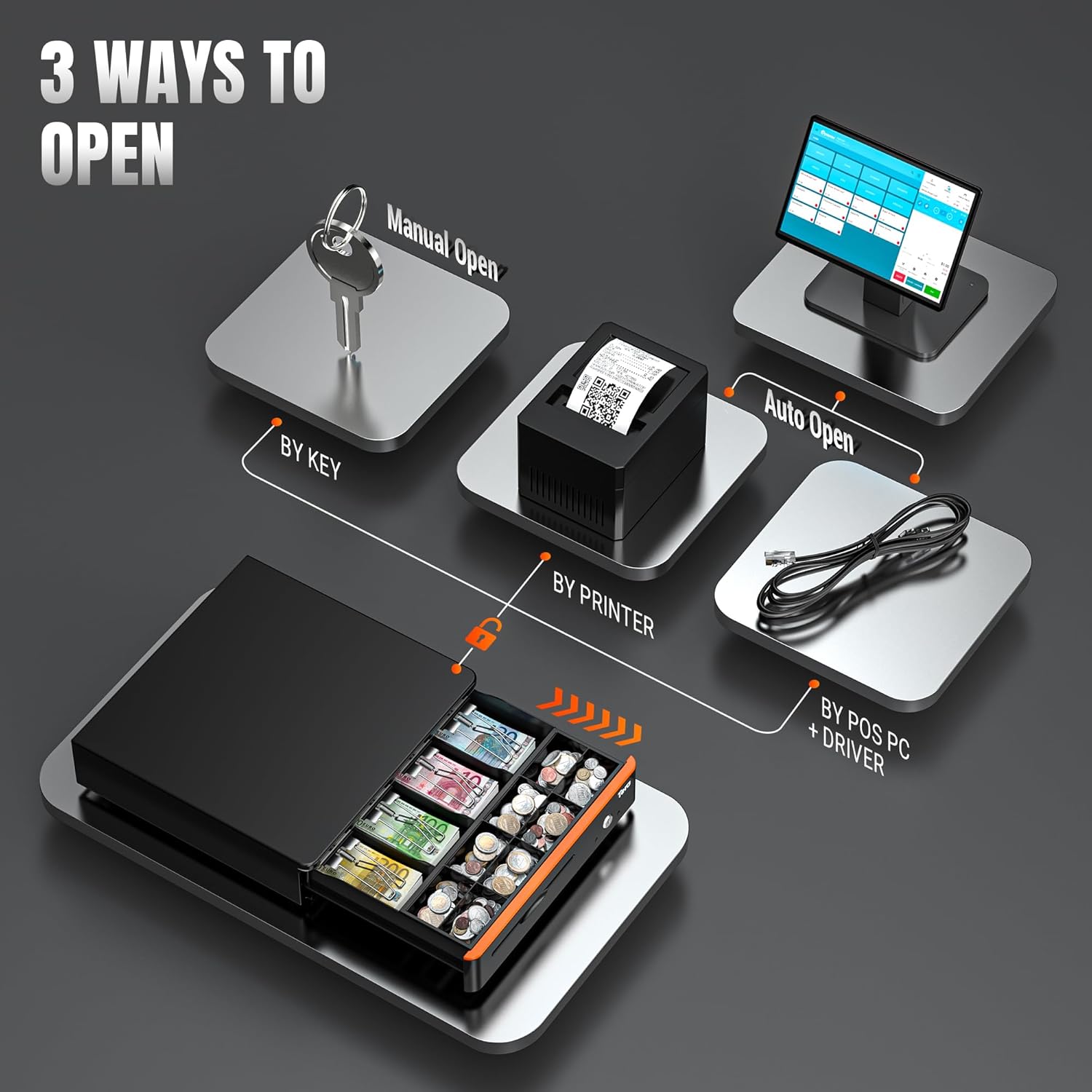 - 【3 Ways to Open the Drawer】 Our cash register with coin compartment is secured with a key/lock system. There are 3 ways to open them: 1-automatic opening via printer, 2-manual opening with key, 3-automatic opening via POS PC + driver. Perfect for business cash registers, our flat rate includes 5 keys as an extra backup.