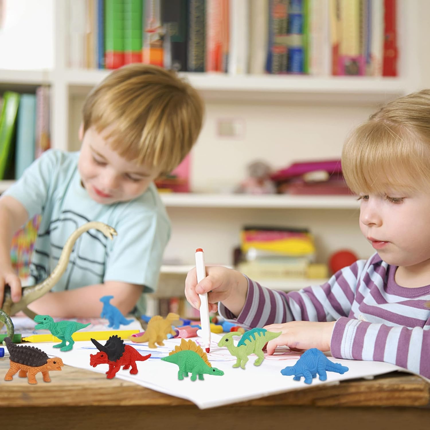 - Educational Pencil Erasers: Our erasers set helps to develop kid's creativity, patience, and hand-eye coordination. The bright colors and attractive figures will easily attract kid's attention and draw them to the fancy dinosaur world.