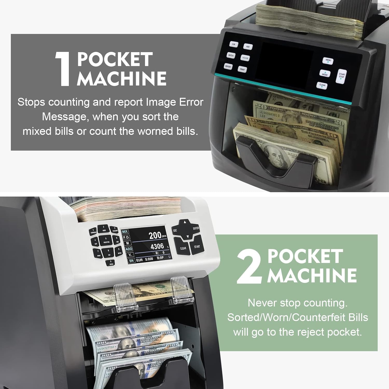 - Mixed Denomination Bill Counter and Sorter: Mixed denomination money counter machine counts and reports total value, clear breakdown of quantity and value by Denomination. With two pockets design, it also sorts the money by currency type/denomination/face/orientation