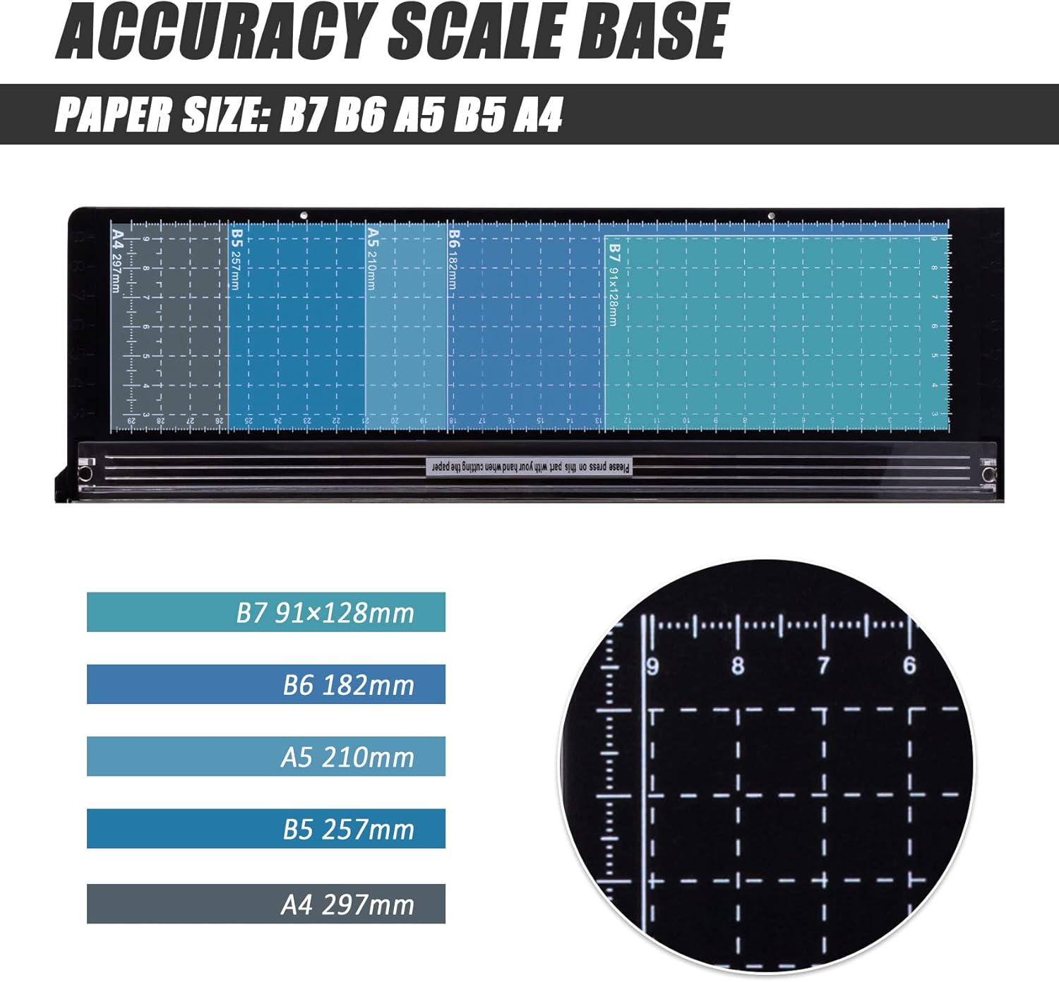 • EFFORTLESS SHARP CUTTING : Ergonomic Design arm and long handle, more effortless when cutting paper. Upgrade steel blade cut paper more neatly and smoothly;Paper Trimmers range: B4, A4, B5, A5, B6, B7;Not suitable for cutting fabric, leather, metal plates;Say goodbye to cutting struggles