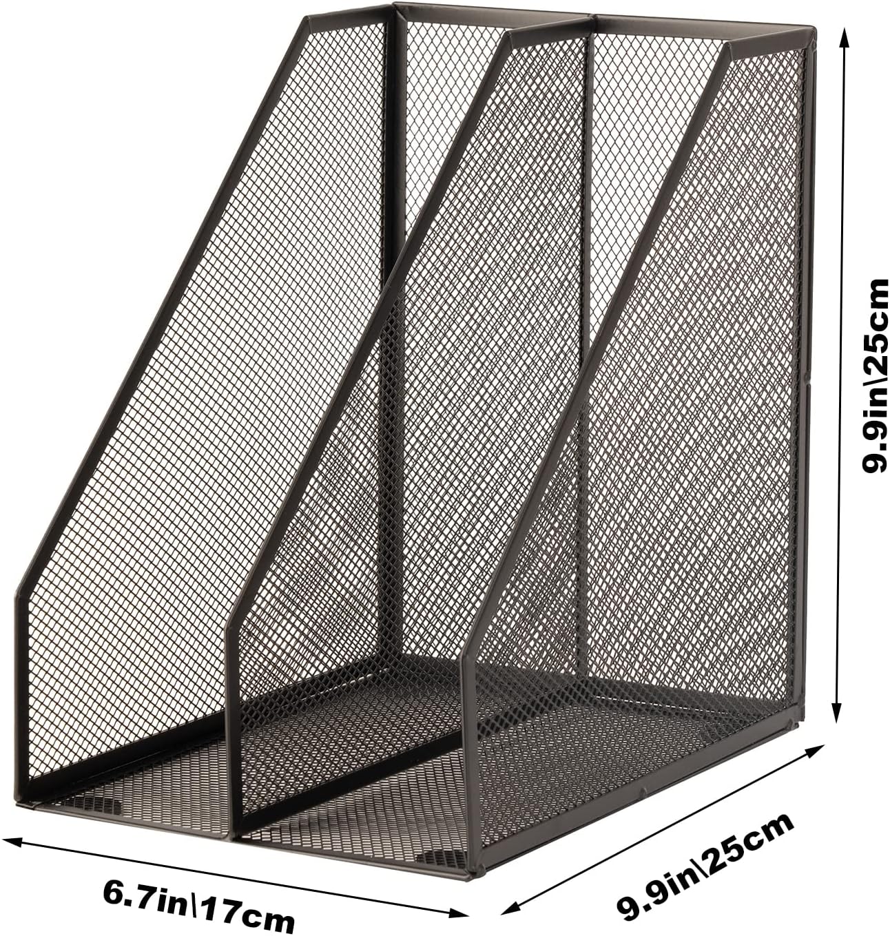 - 【MESH FILE HOLDER】: A set of 2 desktop magazine racks featuring a metal frame, and a wire mesh design. Use a magazine holder on your desktop, on shelves, in cabinets, on bookcases, and anywhere you need to keep paper organized.