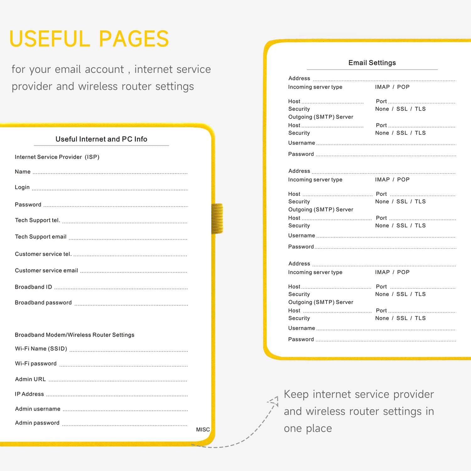 - All-In-One Password Book & More - This password organizer has space to store all the information you may need when you surf the web, including software license information, email settings, wireless router settings, and notes section.