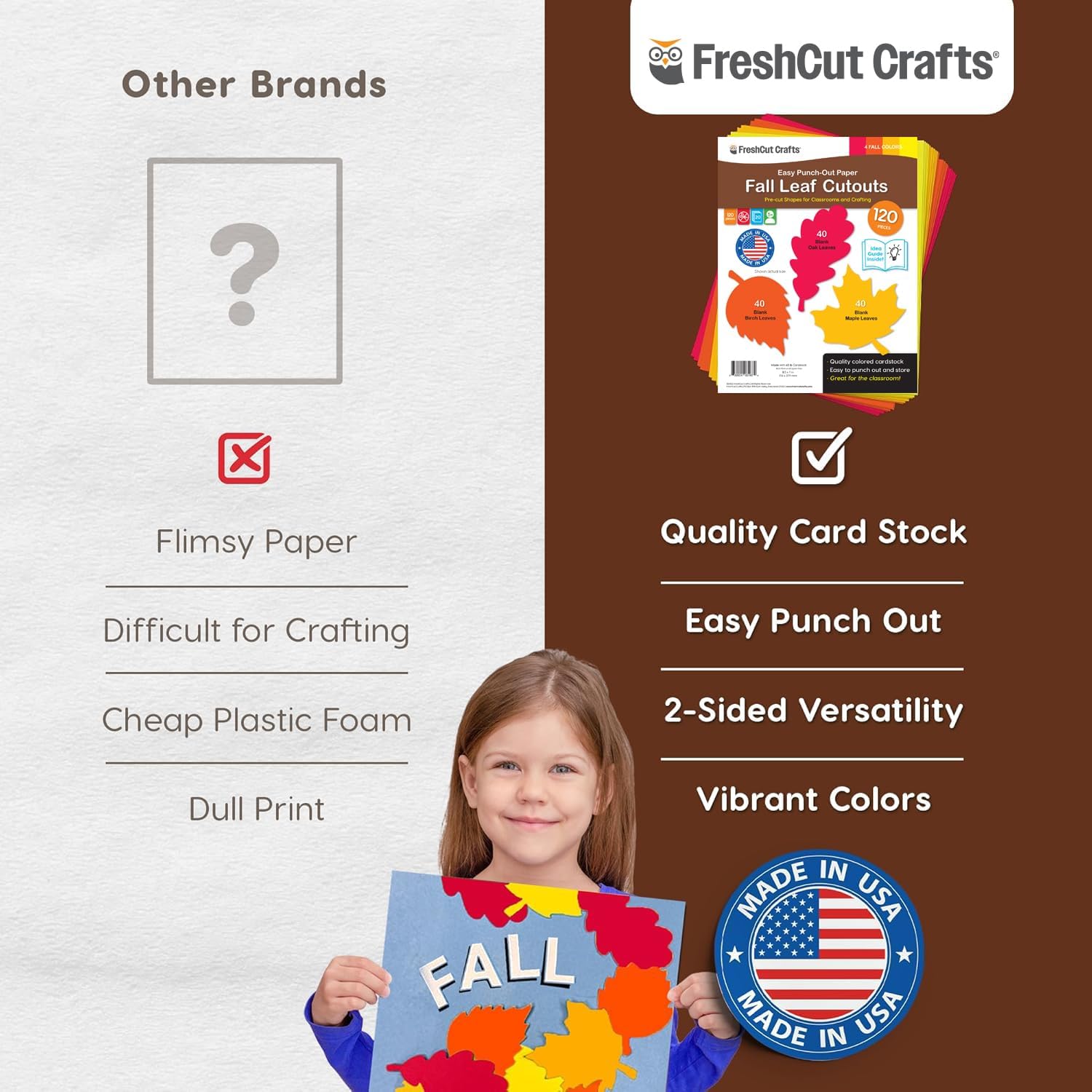 - LEAFY CREATIVITY: Create a world of autumn beauty with our set of 120 punch-out Fall leaf cutouts! Each leaf is crafted from high-quality card stock, offering a variety of shades in bright yellow, orange, and red. But that's not all - included inside is an IDEA GUIDE, brimming with 12 imaginative ways to utilize our paper leaf shapes. Whether you're embellishing seasonal displays, or creating stunning crafts these versatile cutouts are sure to inspire your creativity!