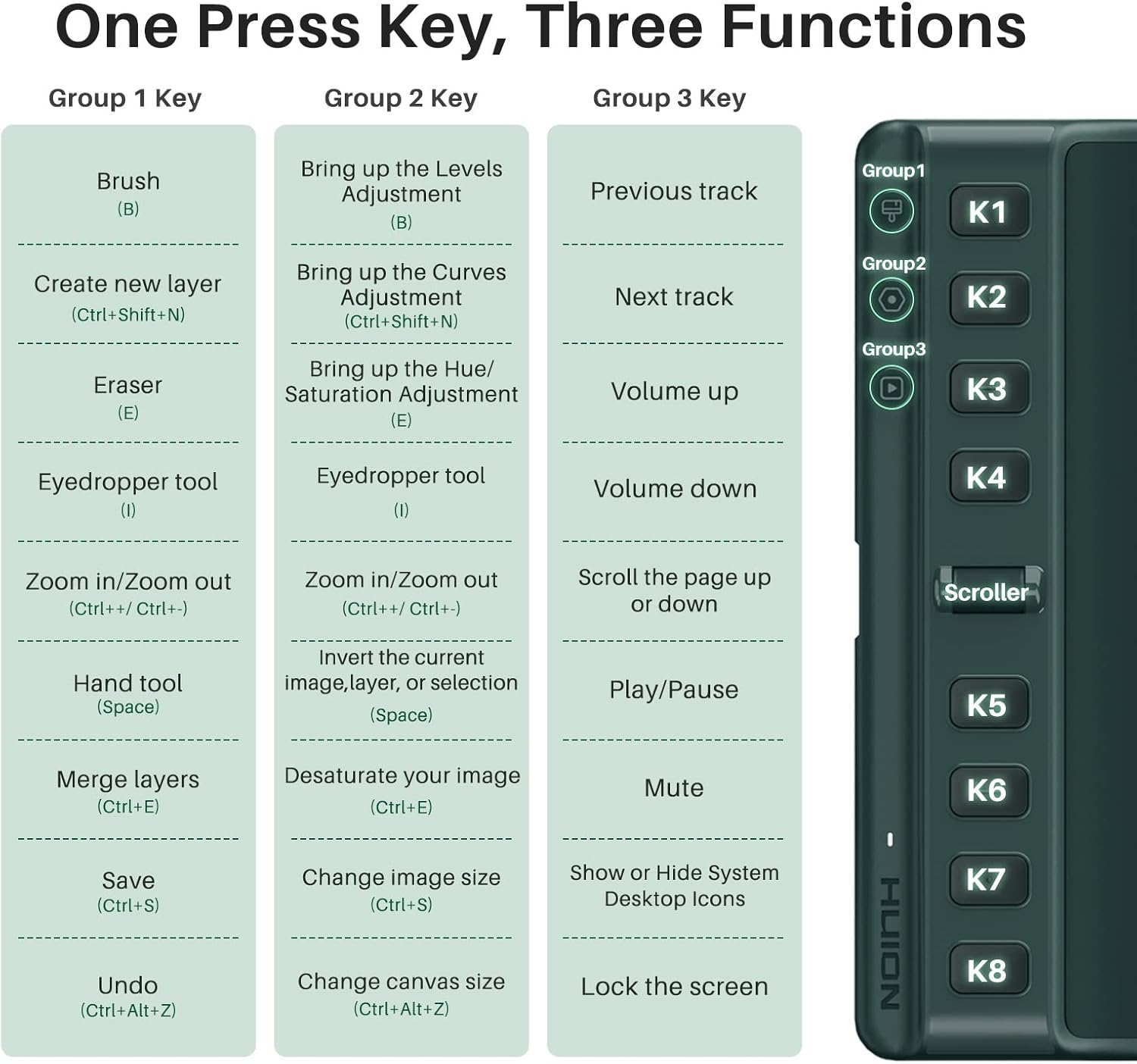 - Programmable Scroll & Shortcut Keys: Unique scroll wheel & 8 press keys can be customized to your favorite shortcut so that your creative work become smoother and more efficient. You also can change the setting for different apps.