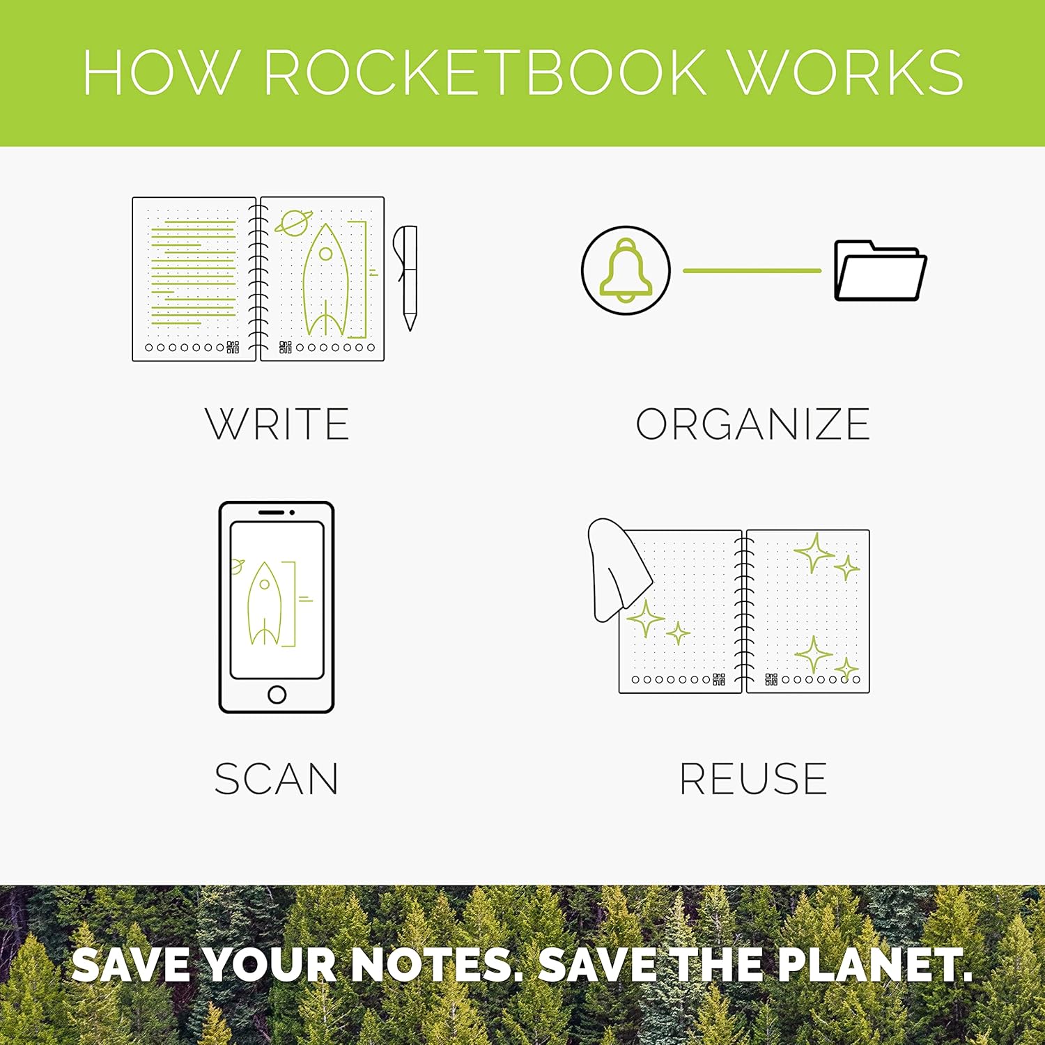 • How To Use: Allow 15 seconds for ink from a Pilot Frixion pen, marker, or highlighter to dry in order to bond to Rocketbook's specialized polyester composite paper. Use the QR code in the bottom corner to save your notes to the Rocketbook app, then, wipe away the ink with a damp cloth, it's that easy