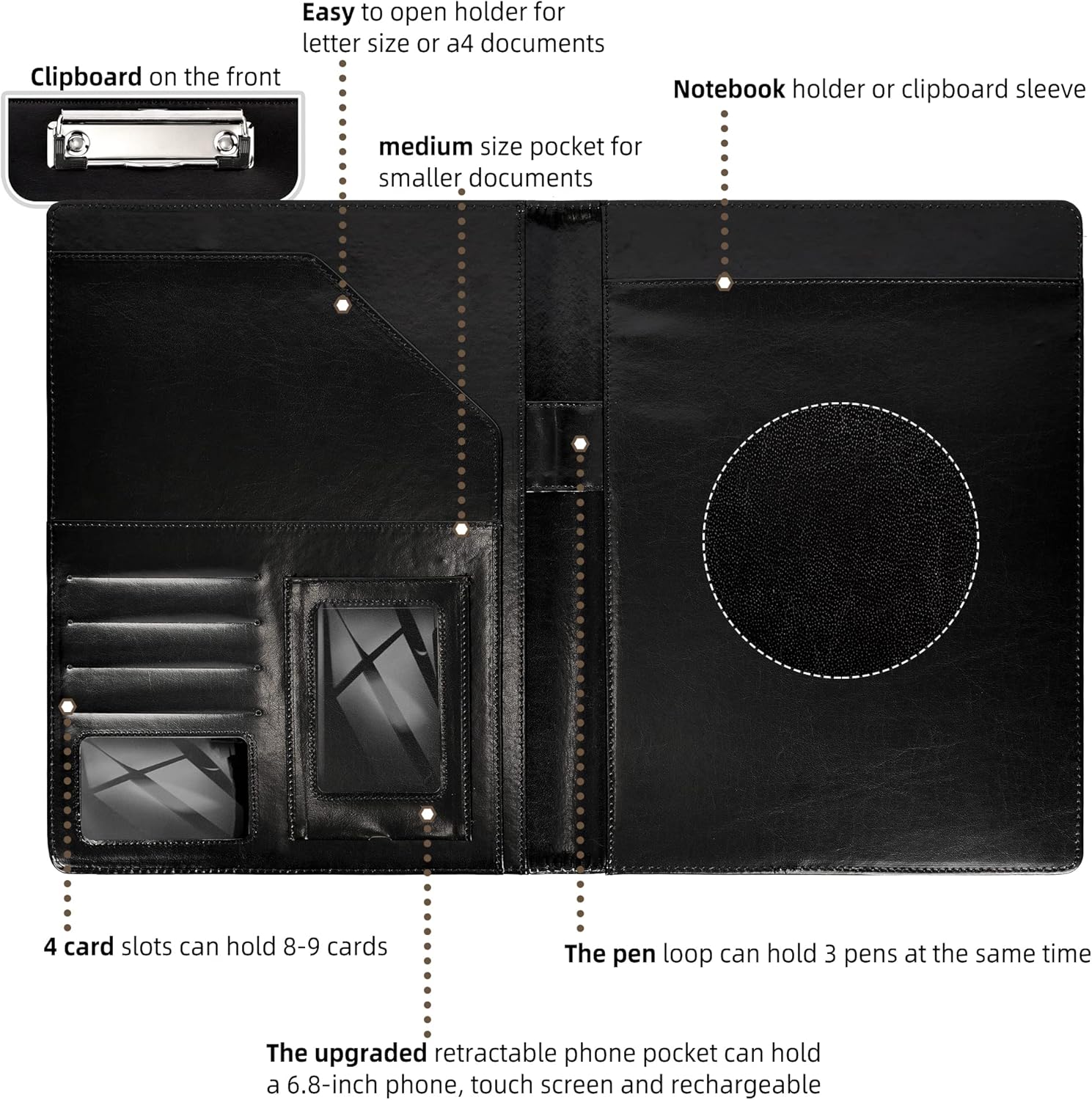 - ✔Powerful and Organized Storage: Our portfolio folder is 360°ー foldable and features a retractable transparent phone pocket (with a charging port) that can accommodate a 6.7-inch phone. The portfolios also have 4 card areas next to it. The right side of the leather portfolios has a large pocket and a matching notebook. The versatile pocket design is perfect for all your daily use and business travel needs.