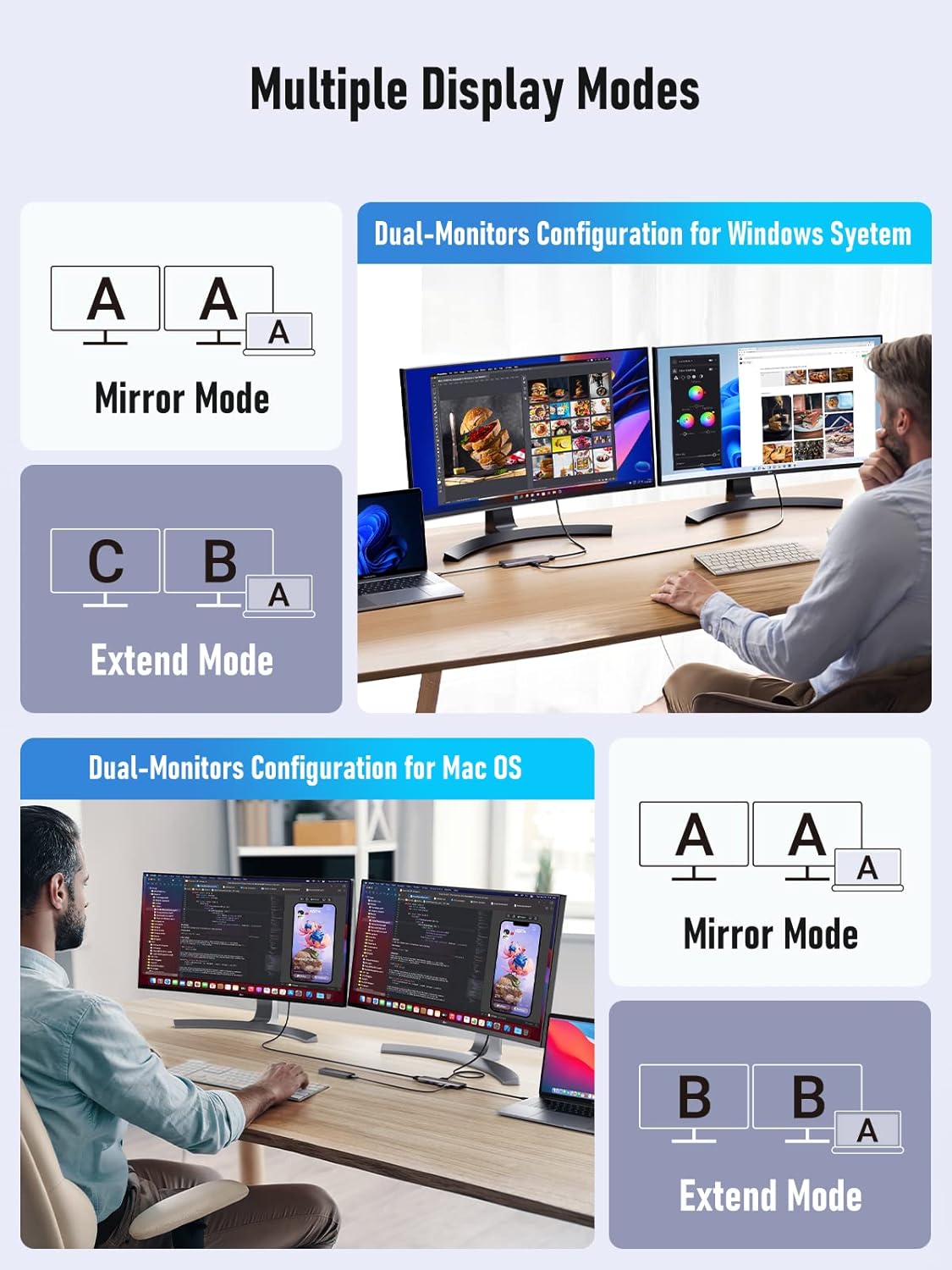 - [4K Dual Screen Display Hub] This ultra-thin USB C dual HDMI adapter supports mirrored or extended modes and provides crystal-clear 3D visuals and high-quality video experiences through its 2 HDMI ports. In Windows systems, dual HDMI ports can achieve three-screen displays in A-B-C mode, while in macOS systems, they can only achieve dual-screen displays in A-B-B mode. It can help you display different pages on two monitors, allowing for special applications such as comparing table data, images.