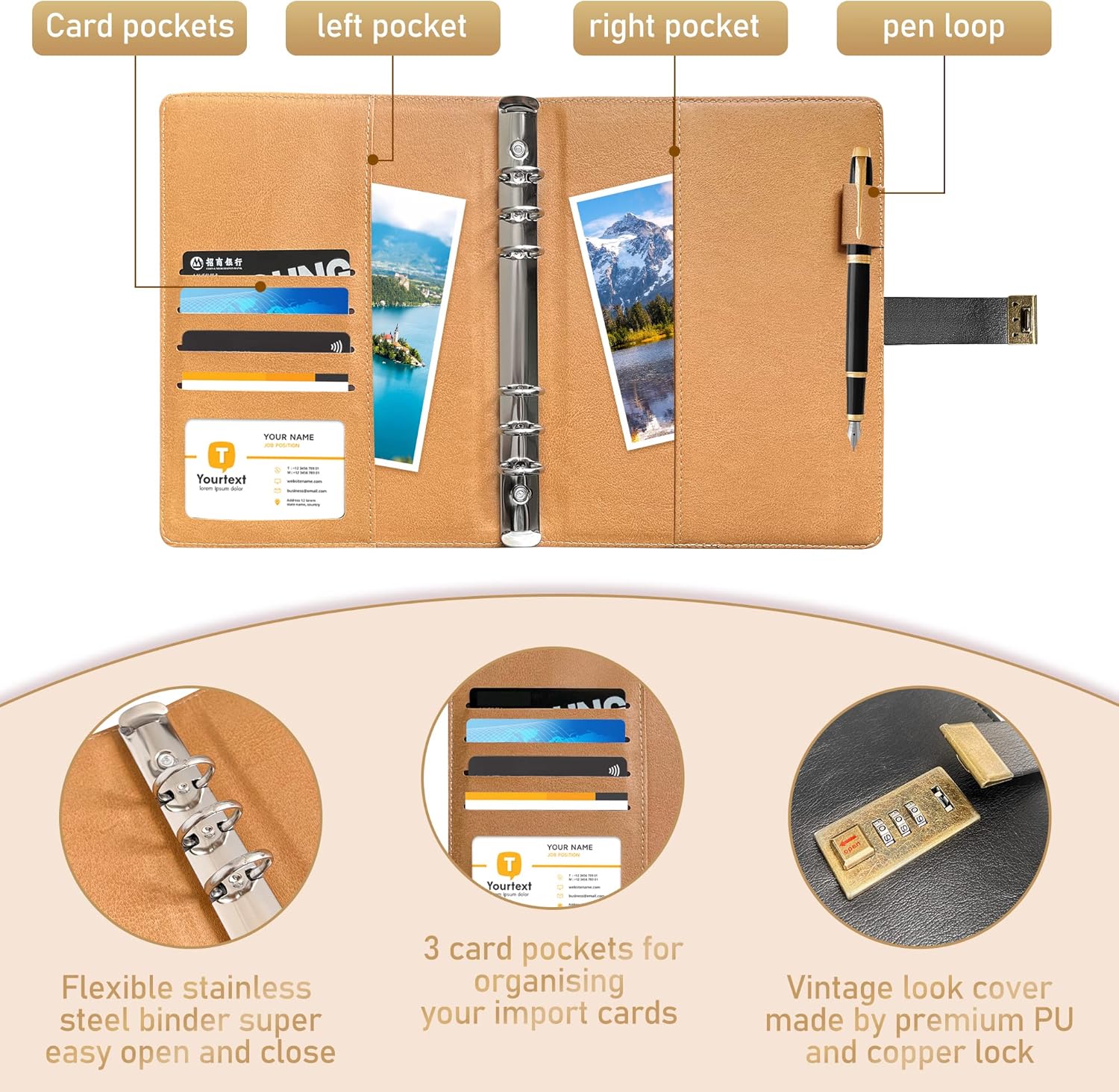 • Multifunctional Password Book: Featuring a durable 6-ring binder crafted from premium PU with a delicate touch and wear-resistant finish, our organizer includes 3 card slots, 2 interior pockets, and a pen holder. Efficiently store and organize bills, passports, ID cards, invoices, tickets, stationery, and more. Ideal for studying, business, reading, meetings, camping, daily planning, and hiking.