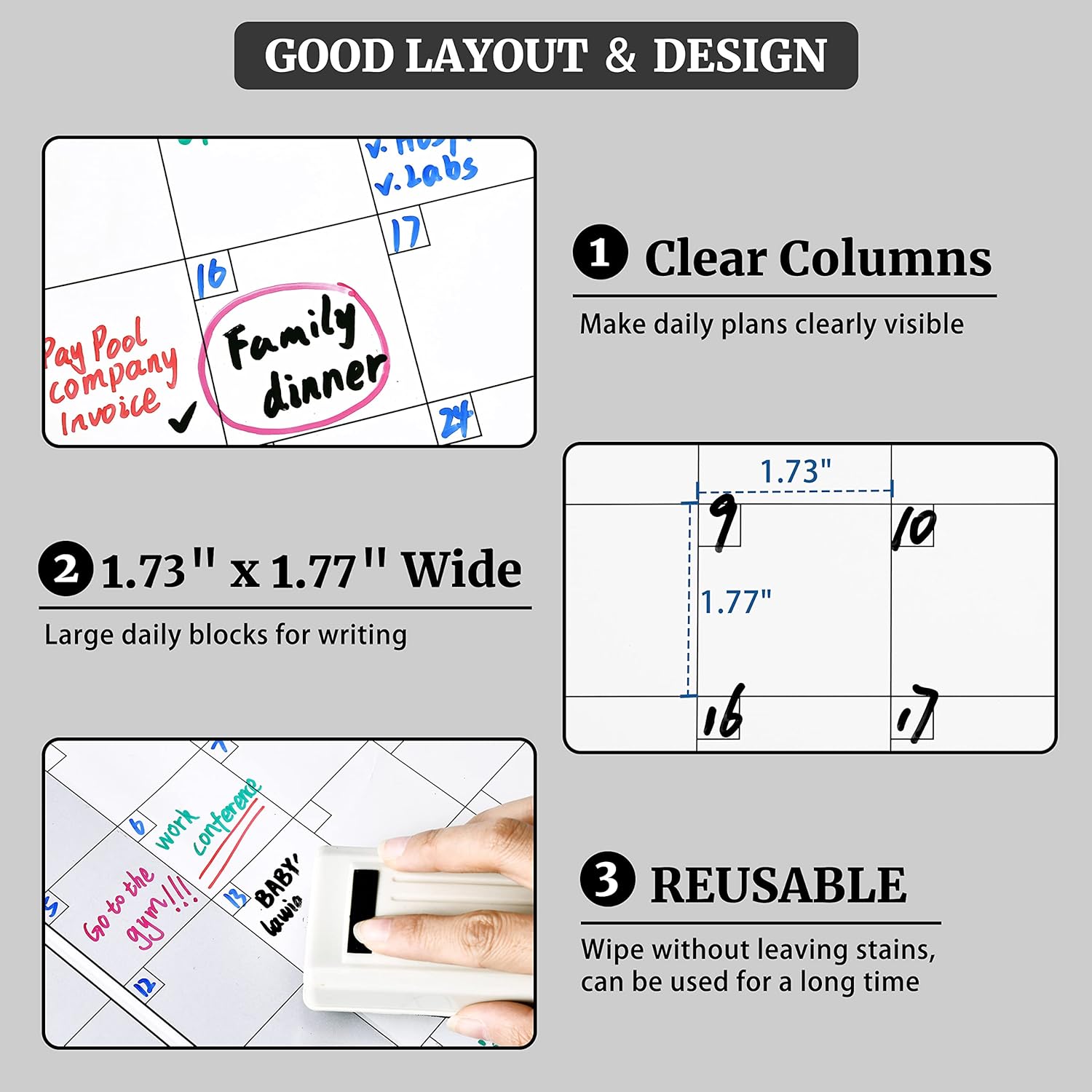 - UNIQUE FEATURES – This reusable calendar uses special treated dry erase reusable & rewritable, giving smooth surface, well dust-proof and wipe very clean. Bright simple background and clear printing make it easier to view and read. This undated wall calendar applies to many kinds of whiteboard marker, wet/dry erase marker, etc.