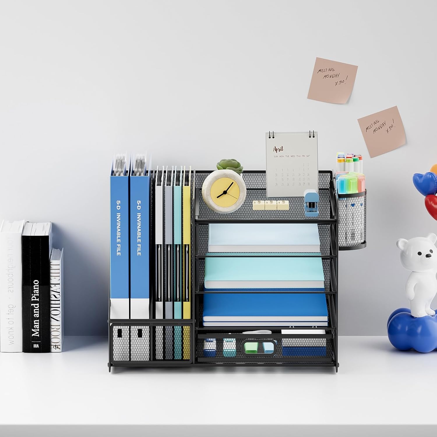 Lavatino Desk Organizer with File Holder, 5-Tier Paper Letter Tray Organizer with Sliding Drawer and 2 Pen Holder, Mesh Desktop File Organizer for Office Supplies (Black)