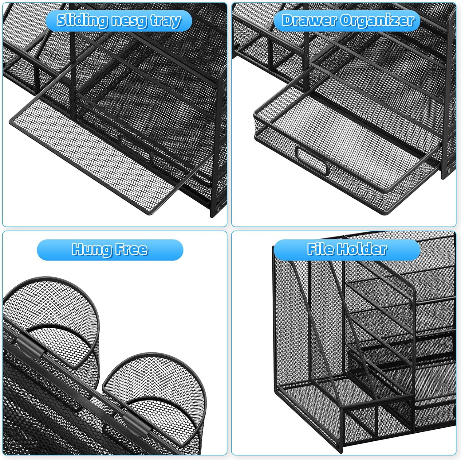 - Multiple Use Organizer: Our office organizers owns 5 sliding trays + 2 Magazine Holders + 2 Hanging Pencil Holders + 1 sliding large capacity drawer which have enough storage space to accommodate all your office supplies and keeps your desktop neat, which is very suitable for offices and schools.