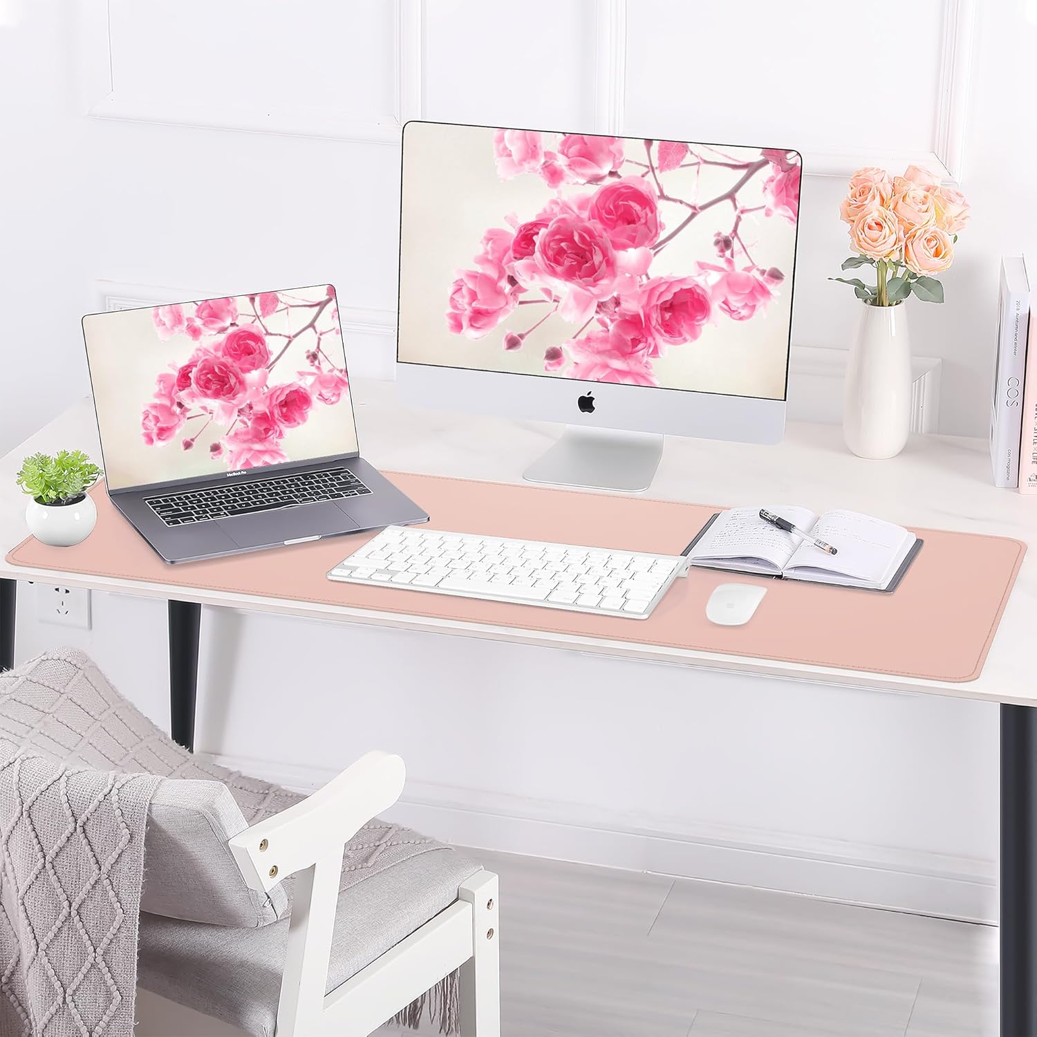 Large Desk Mat -47.2" x 17.5" Leather Desk Pad Protector with Natural Cork & PU Leather, Non-Slip Office Desk Mat, Double-Sided Mouse Pad, Waterproof Large Desk Pad for Office&Home(Pink)