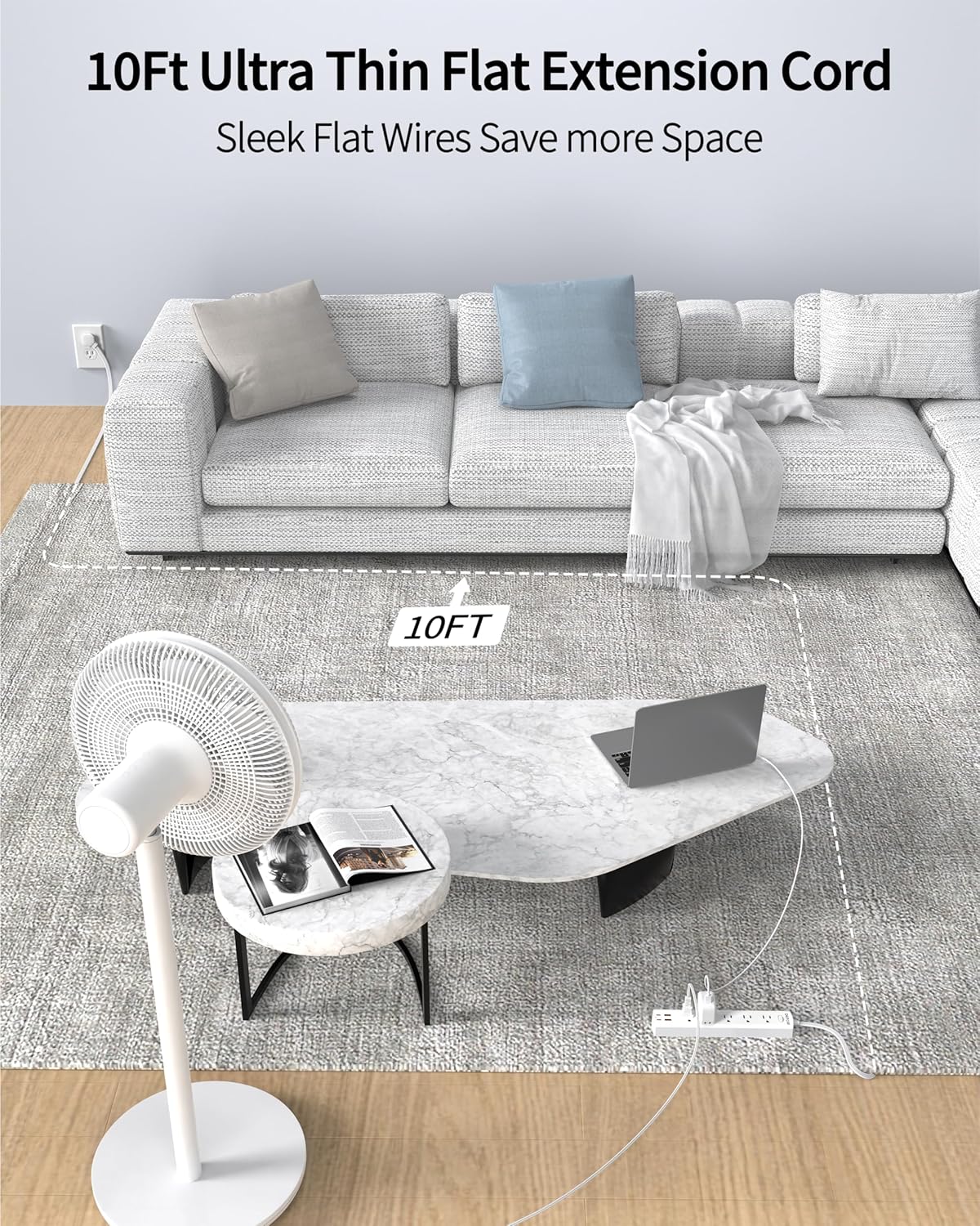 • 【Meet Your Need】-A 10-foot flat extension cord allows it easy to use in all sorts of different areas for plugging it in within the reach of your electrical product. You even can’t feel it under the carpet. So it's easy to run it under a rug or along walls without adding unsightly bulk or creating a trip hazard.