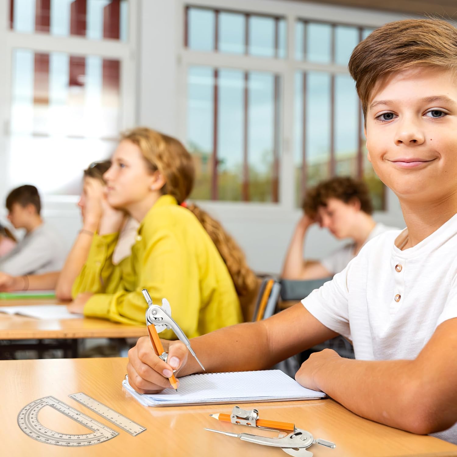 - High Quality Material: math compass bulk is made of high-quality metal, sturdy and durable, not easy to break or deform; the clear protractor and ruler are made of high-quality plastic, with clear scales, fewer scratches, and are sturdy and durable, transparent design can see the content of the page, which helps you to easily measure, for your study or work to bring convenience