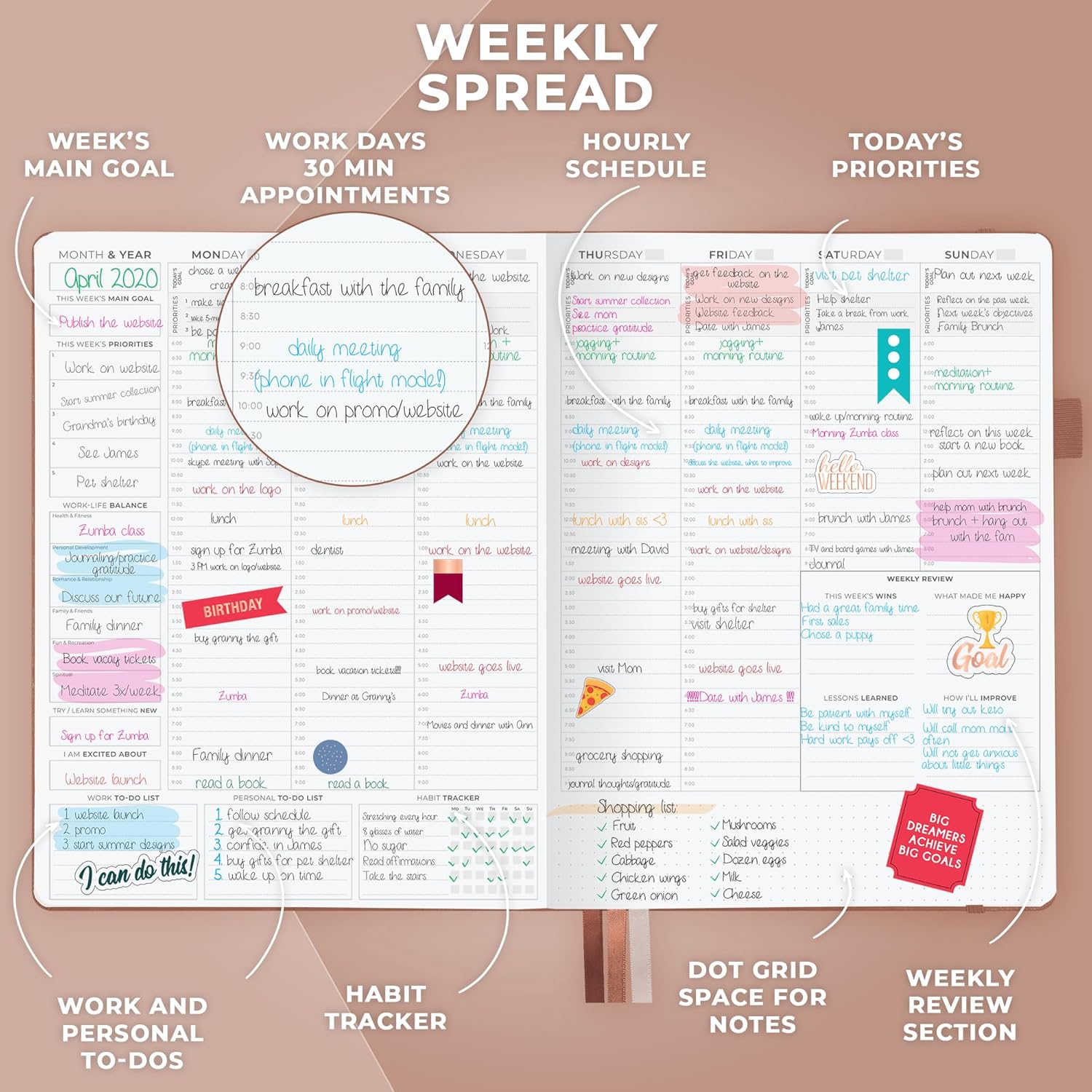 - TOP QUALITY, USER GUIDE & STICKERS - This planner and organizer for women and men comes with stickers, and user guide, an eco-leather cover, thick 120gsm paper, an elastic band, a pen loop, and lay-flat binding.
