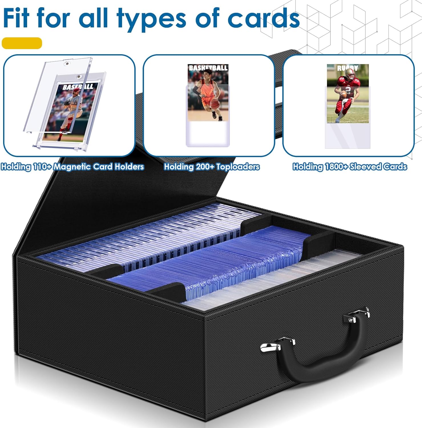 - Holds 110+ Magnetic Card Holders: the size of our deck card case is 11.5x10.5x5.1 inches, it's large enough to store 1800+ Sleeved Cards or 200+ Standard 35pt Toploaders or 110+ Magnetic Card Holders.