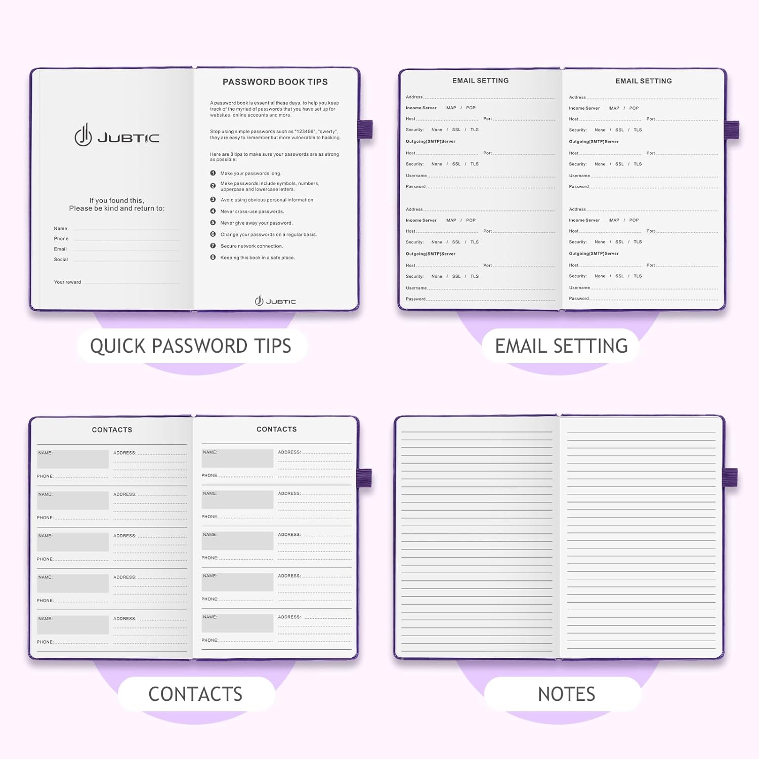 JUBTIC Password Book with Individual Alphabetical Tabs, 7"x10" Internet Password Keeper Book for Seniors, Password Notebook and Organizer/Notes Section,Purple