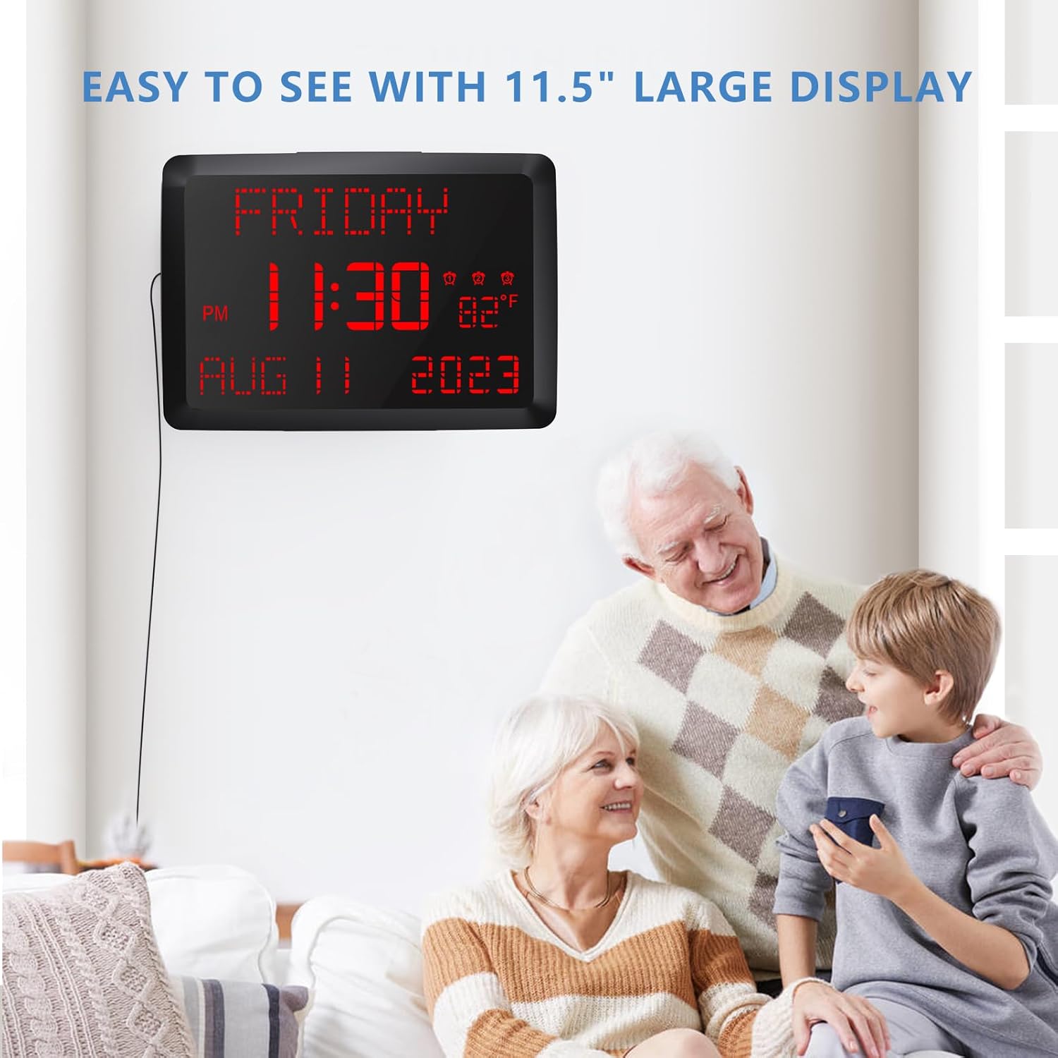 - 11.5" LED DISPLAY - The 11.5 inch large alarm clock with clear LED digital display makes it easy for the elderly to see the time.5 levels lights options for adjusting the brightness for those that are sensitive to light while sleeping.If you prefer to sleep in the dark, you can adjust this alarm clock's display to a minimum.