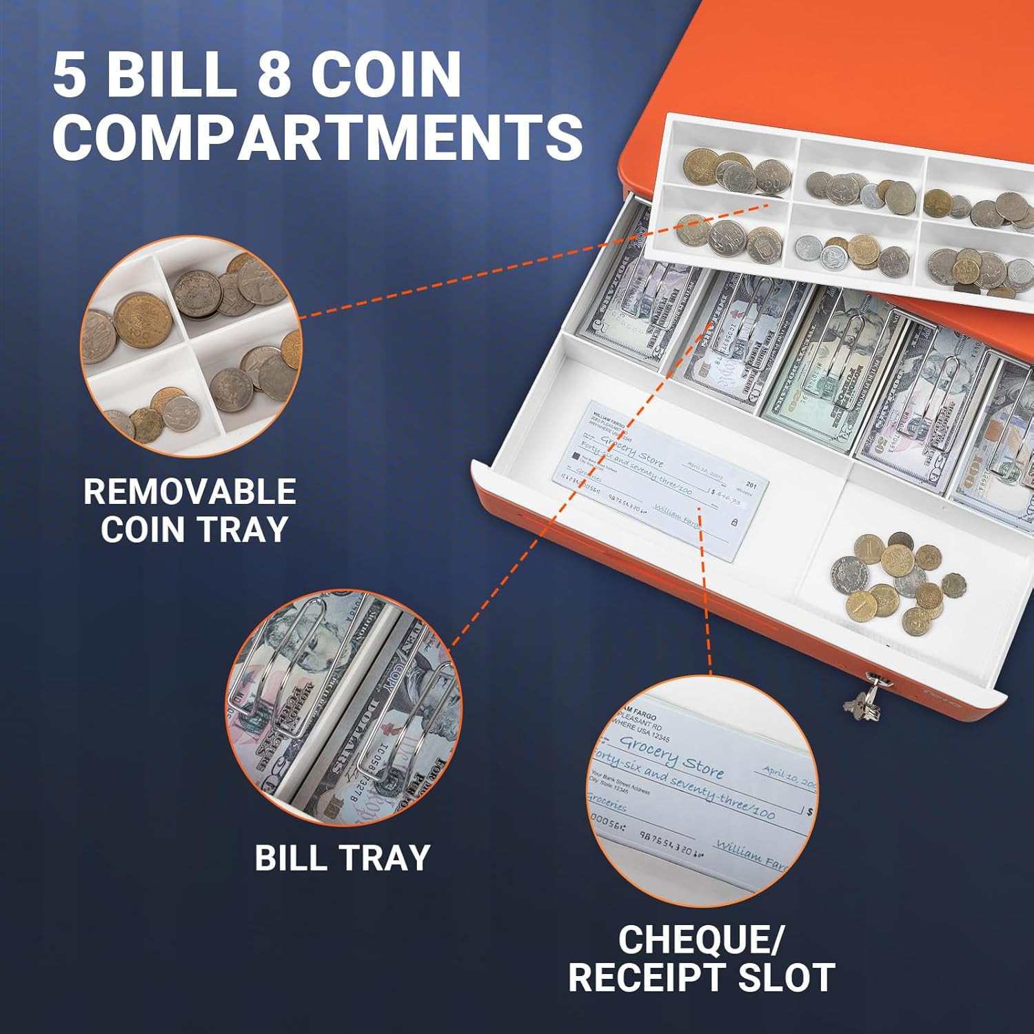 Tera 16 inch Cash Drawer: with Micro Switch Auto Open Heavy Duty Insert Tray 5 Bill 8 Coin for POS System Removable Cash Tray Media Slot 24V RJ12 Key-Lock (Round Corner) for Retail 405R Orange