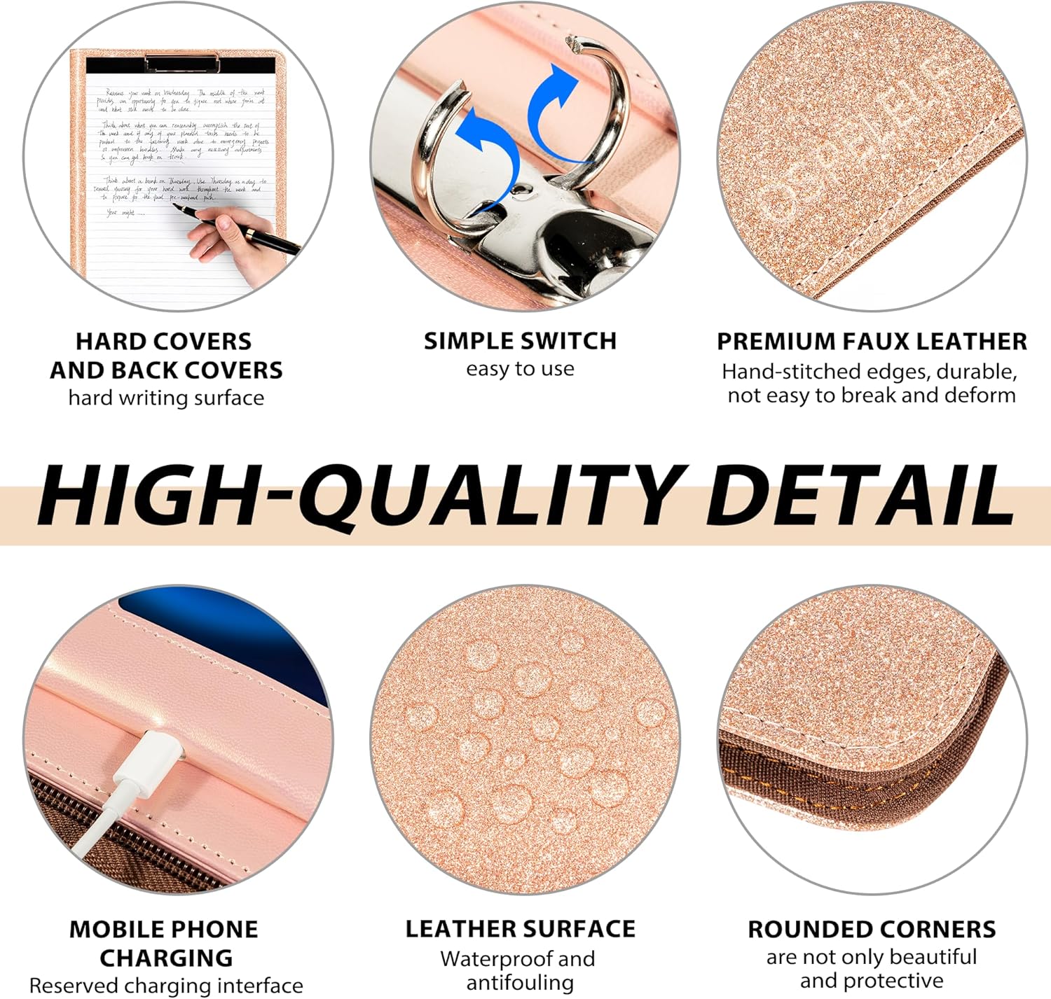 Leather Clipboard with Storage, Zippered Padfolio Portfolio Organizer, 3 Ring Binder 1 Inch, Notepad, Tablet Sleeve, 5 Dividers with Pocket, Stickets for Office, Nurses, Students, Teachers Rose Gold