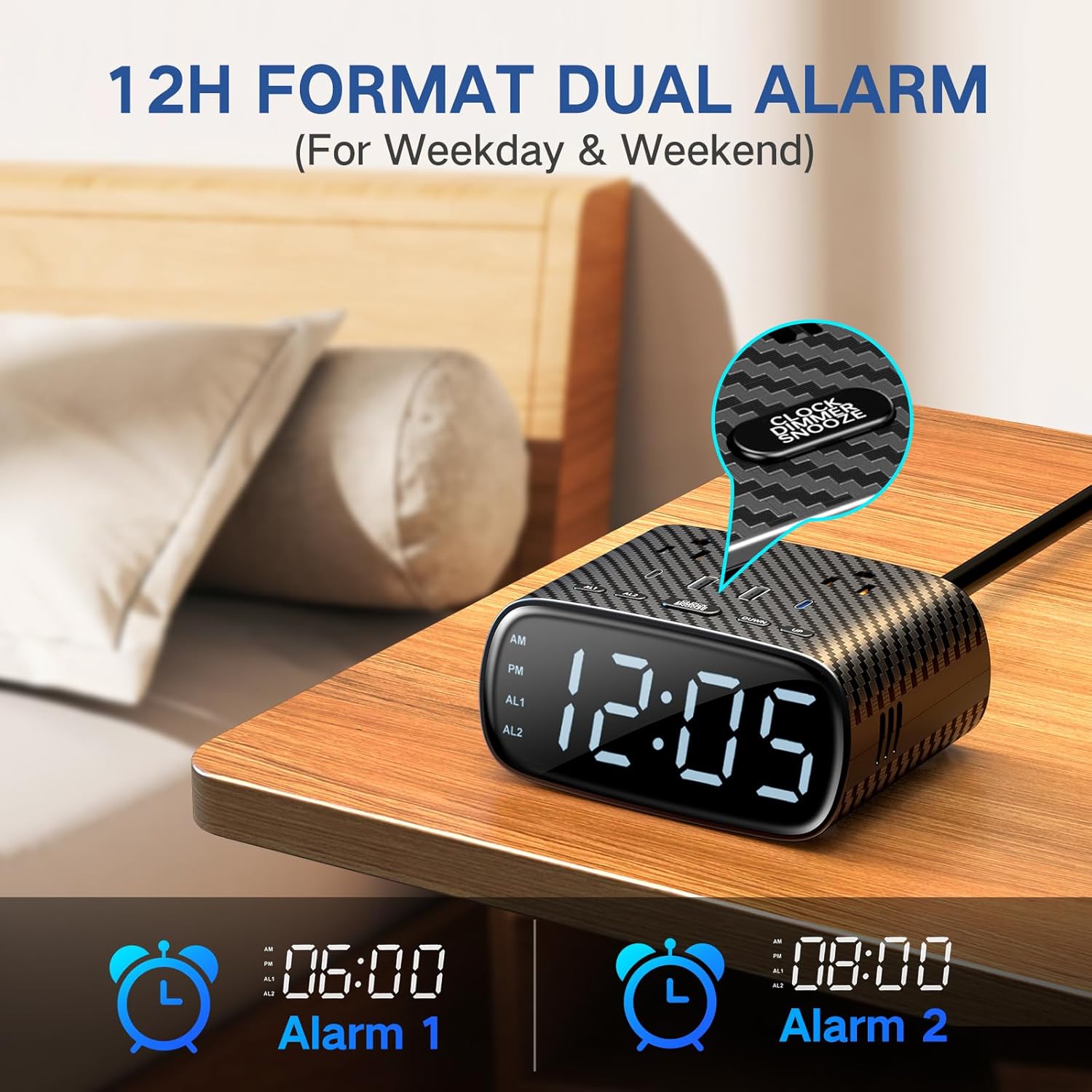 - ใ๐๐๐ ๐๐ฅ๐๐ซ๐ฆ๐ฌ & ๐๐๐๐ ๐๐ข๐ง๐ฎ๐ญ๐๐ฌ ๐๐ง๐จ๐จ๐ณ๐ใThere is designed with two alarms that one alarm wake you at work days and another will wake you at weekend days. Acrroding to diffrent days, this alarm clocks for bedrooms function is able to easily achieve two modes switching. When Alarm Clock is ringing, press the button to temporarily silence the alarm about 9 minutes by default.