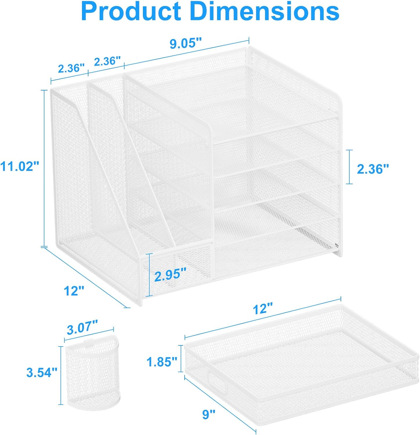 Lavatino Desk Organizer with File Holder, 5-Tier Paper Letter Tray Organizer with Sliding Drawer and 2 Pen Holder, Mesh Desktop File Organizer for Office Supplies, White