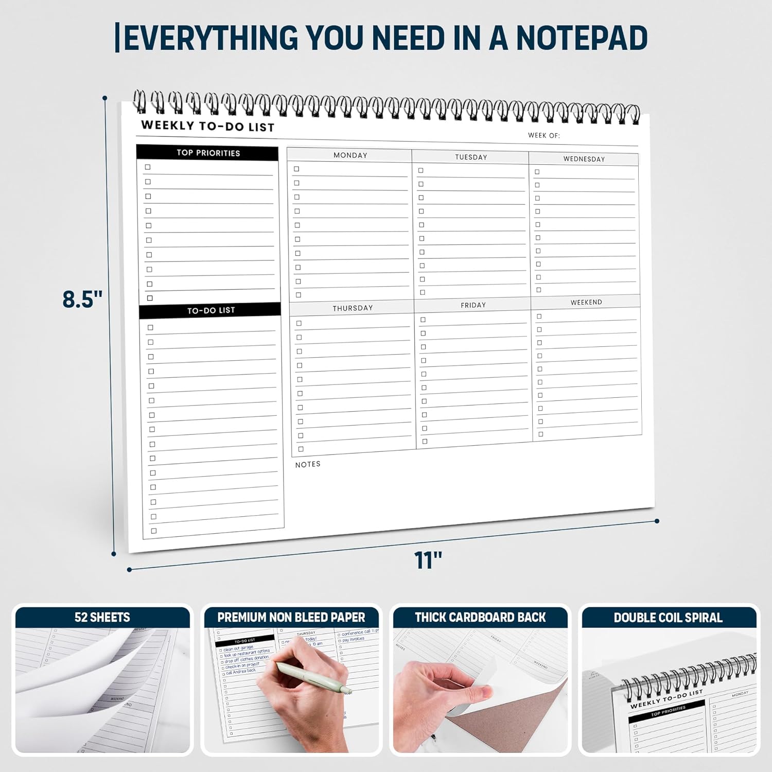 - Minimalist Design to Boost Productivity: Experience the perfect balance of minimalist and functional design with our weekly to-do list notepad. Each notepad measures 8.5” x 11” and has 52 sheets, so there is enough space to write down everything you need to do. Made with a minimalist black and white design and premium materials, our notepad is the perfect tool to keep you on track and motivated throughout the day!