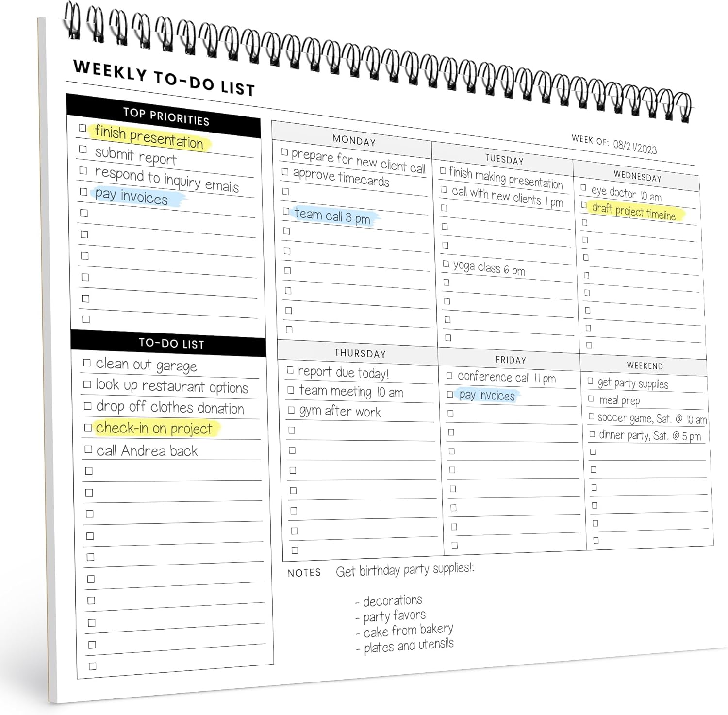 - Style : Weekly To Do List (Spiral)