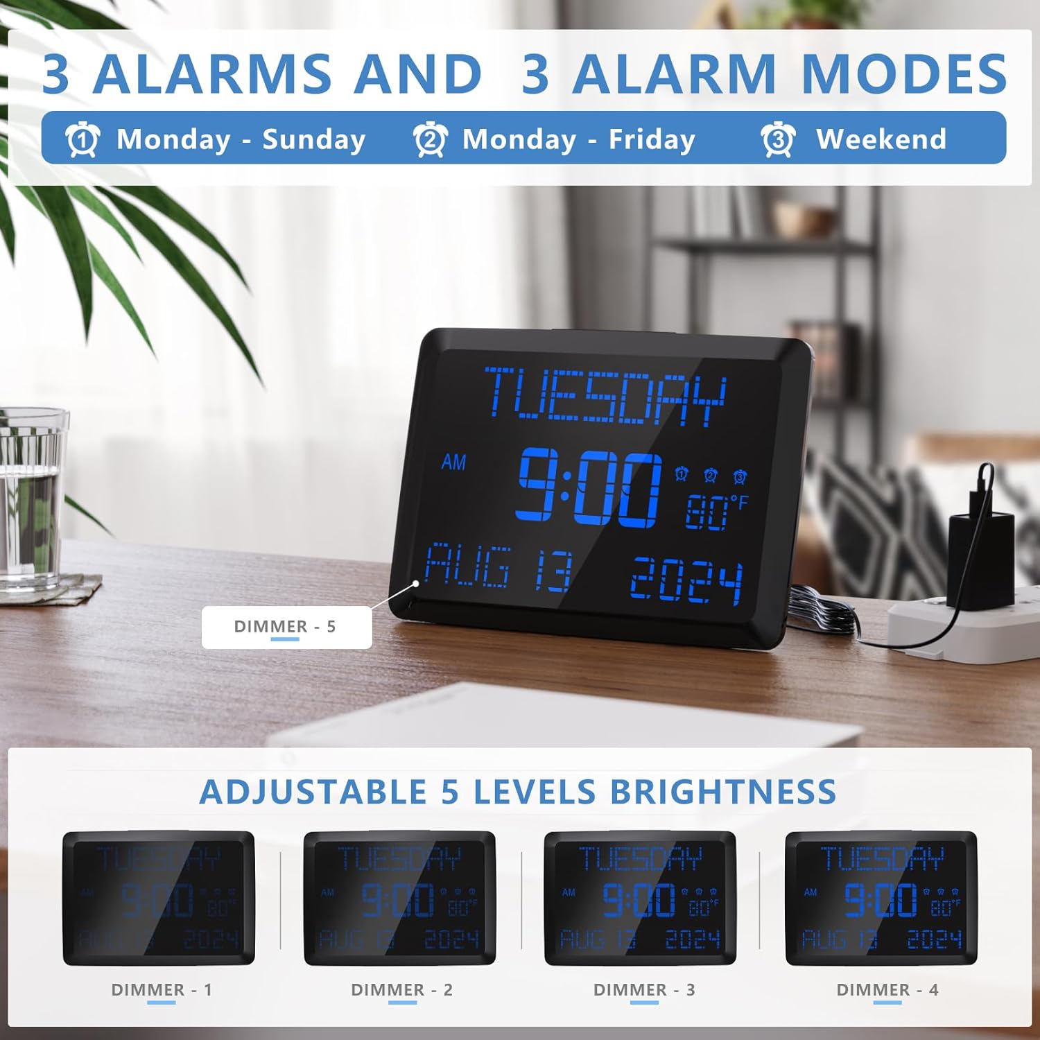 - 11.5" LED DISPLAY - The 11.5 inch large alarm clock with clear LED digital display makes it easy for the elderly to see the time.5 levels lights options for adjusting the brightness for those that are sensitive to light while sleeping.If you prefer to sleep in the dark, you can adjust this alarm clock's display to a minimum.