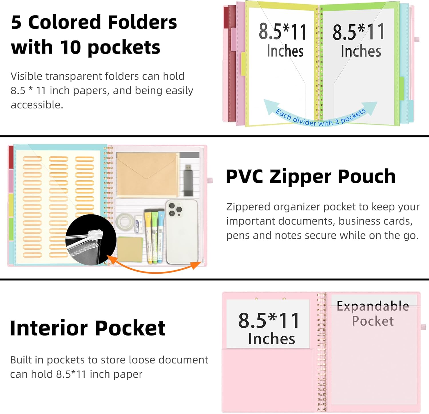 - 【Stay Organized】The portfolio organizer features a clear, zippered pouch for secure on-the-go storage of documents and notes, interior pocket to store letter size papers and important loose documents. Clipboard comes with 5 extra Plastic Colour Folders with 10 pockets fit in all standard US letter size sheets(11*8.5''), plus 39 file folder labels self adhesive stickers for organized use.
