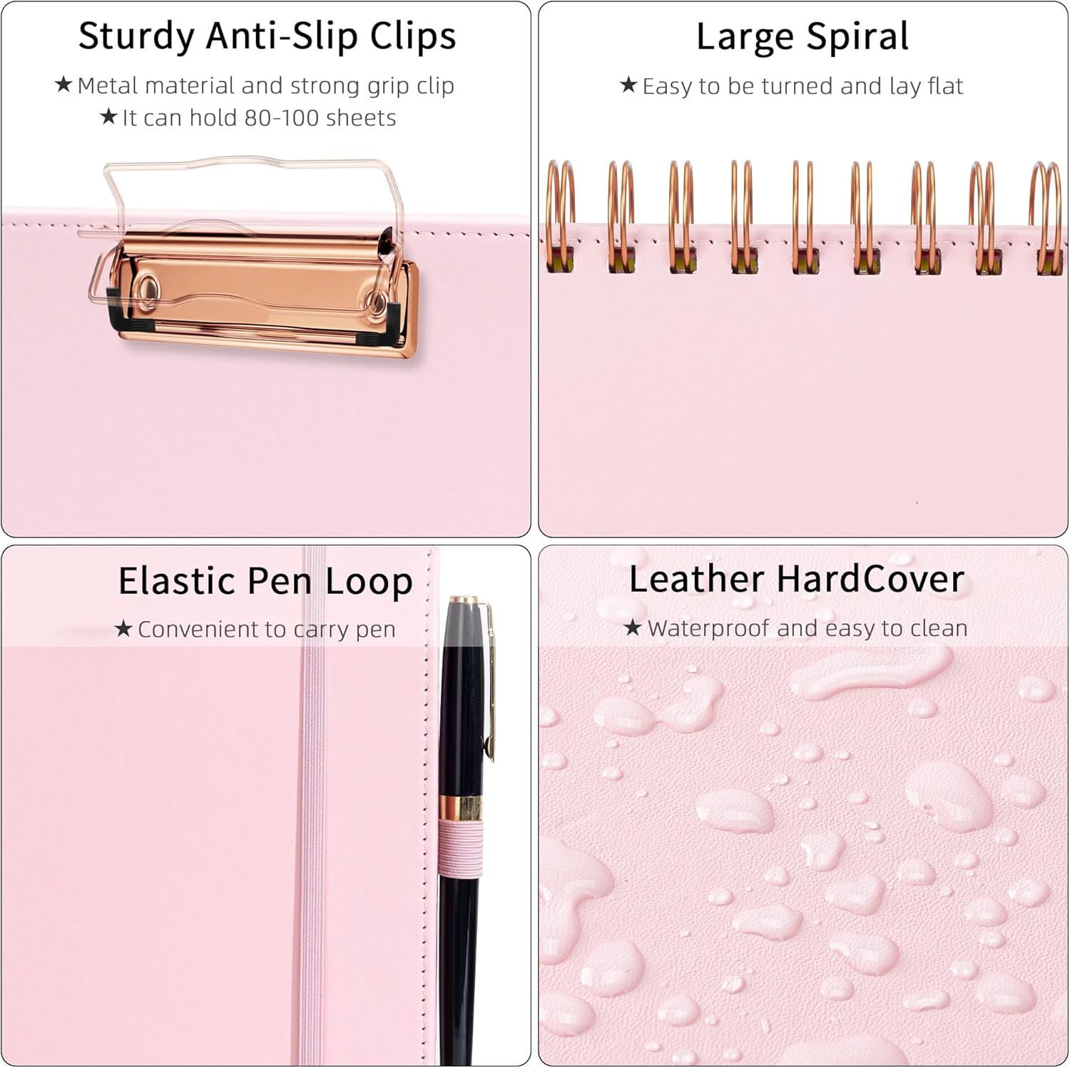 - 【Powerful Functions】Low-profile clip arc design make it easy gripping and extraction paper, holds up to 80-100 sheets paper. Clip board has a Hidden retractable hanging hole on the top, Easy to hang. Pen Loop for quick, easy storage. Double-loop Metal Spiral have the ability to flip the cover to the backside and use it like a clipboard, no creases and cracks to offer durability. Elastic closure, The elastic band keeps the portfolio closed and prevents contents from getting damaged.