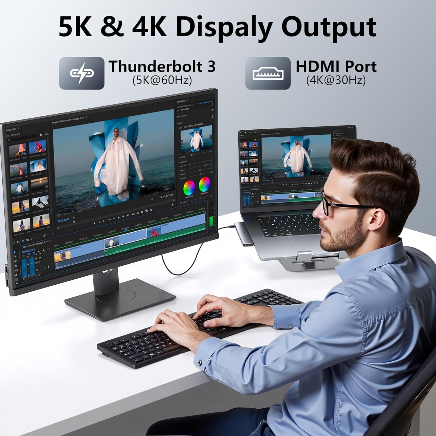 - Dual USB C Female Port: The first usb c port is a original thunderbolt 3 port like the macbook itself which support data transfer up to 40Gbp/s, up to 5K display and up to 100W power; Another usbc port is a data transfer port which speed can up to 5Gbps, a best port for USB C Device like ssd hdd,etc. Notice: The second usb c port of this usb c hub doesn't support HDMI output and charging function