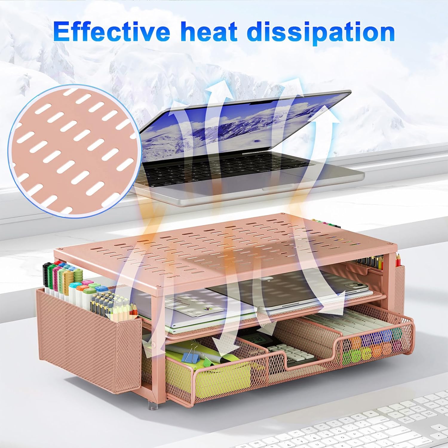 gianotter Desk Organizers and Accessories, Monitor Stand with Drawer and 2 Pen Holder, Desktop Organizer Suitable for Offices and Dormitories (Rose Gold)