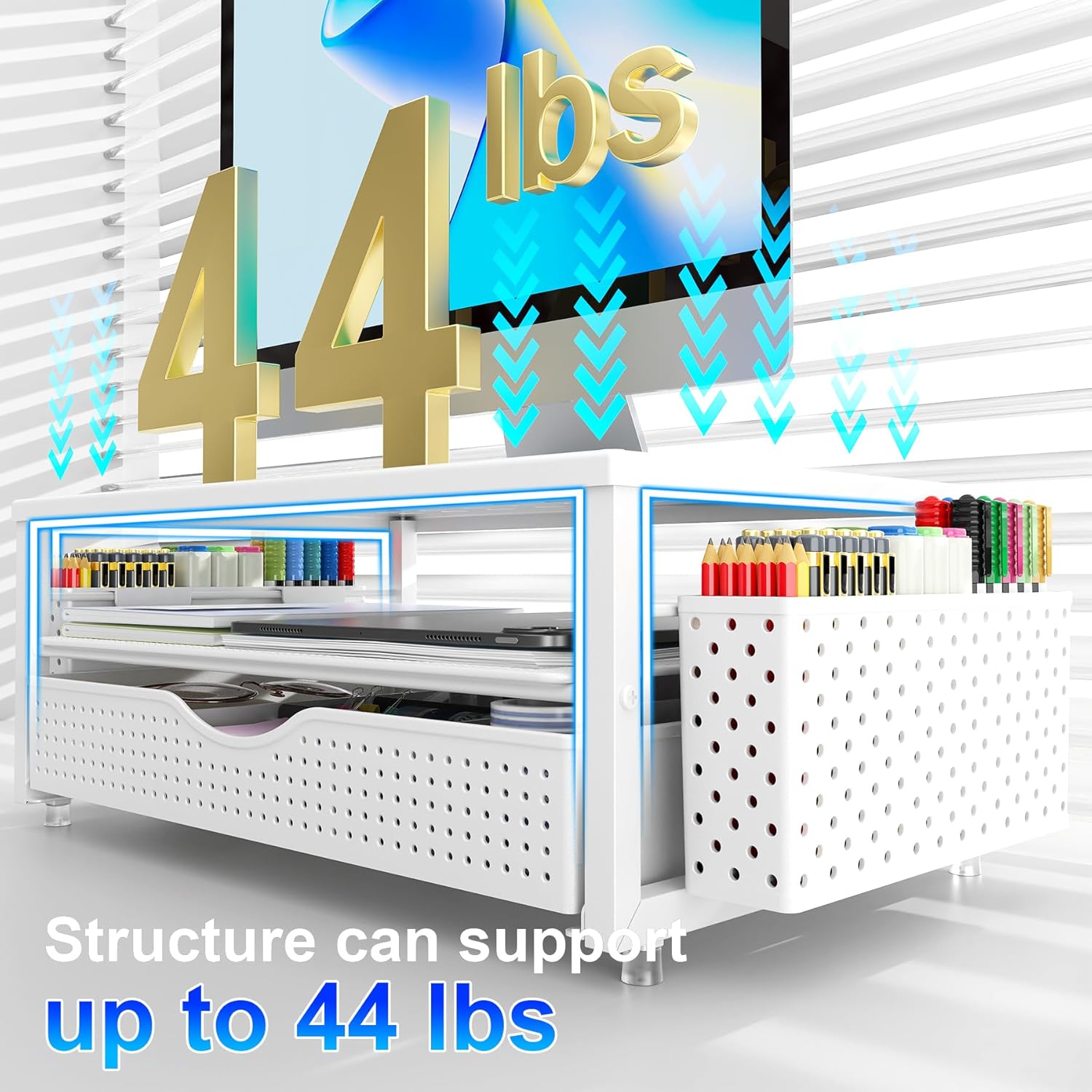 gianotter Desk Organizers and Accessories, Monitor Stand with Drawer and 2 Pen Holder, Desktop Organizer Suitable for Offices and Dormitories (White)