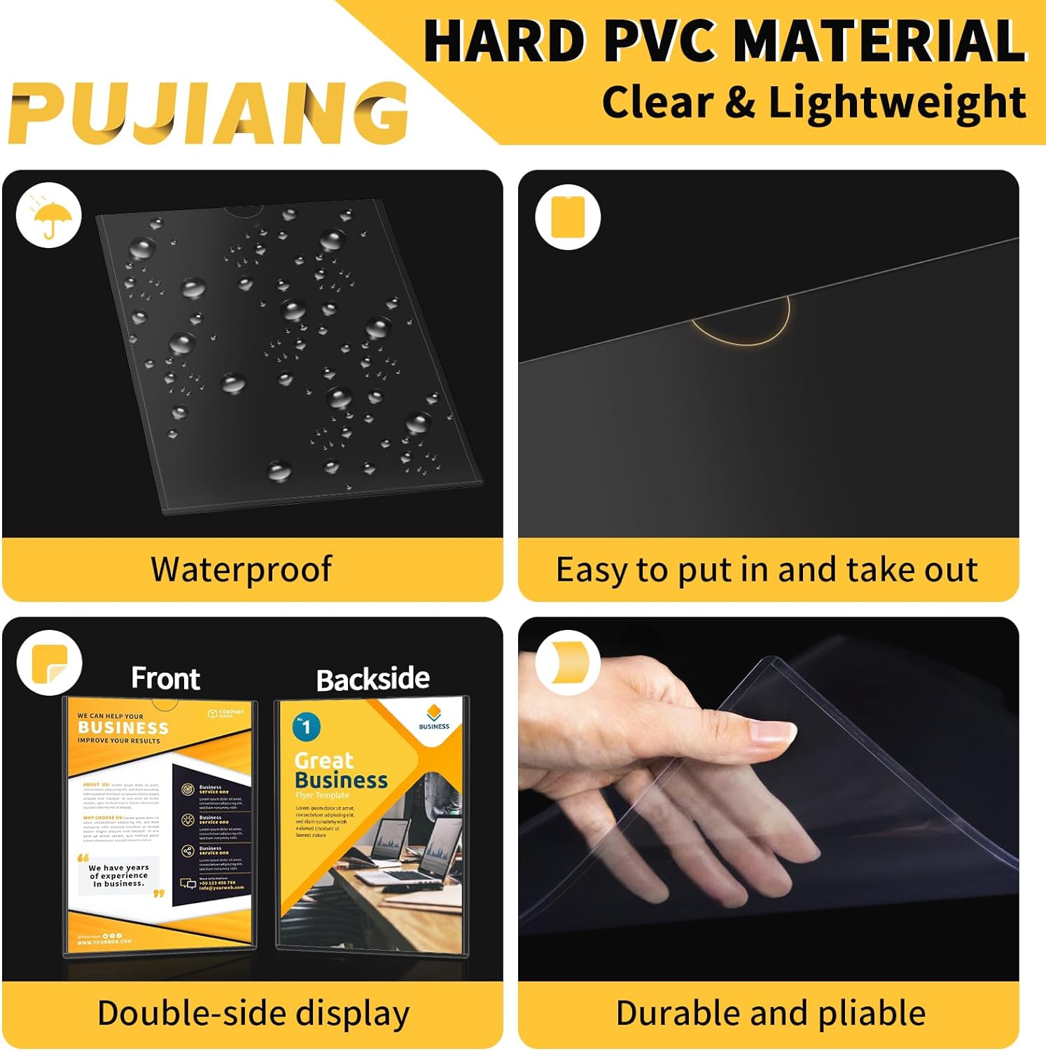 - TRANSPARENT RIGID MATERIAL: The rigid plastic sleeves Made of 100% highly transparent rigid PVC material, stiff material, display information without distortion, waterproof, dirt-proof, abrasion-resistant, scratch-resistant, smooth surface, dry erase.