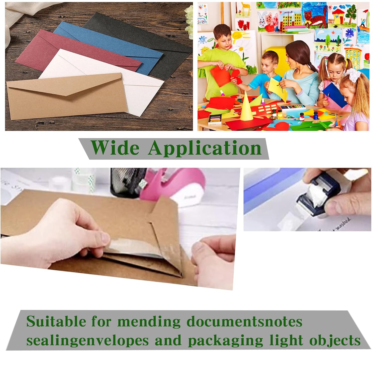 - It has wide applications: The replacement tape can be used to seal envelopes, repair broken files, stick torn papers or pages, and also be used as packaging tape for gifts and lightweight items. It is highly suitable for use in holiday gift packaging, offices, homes, and schools.