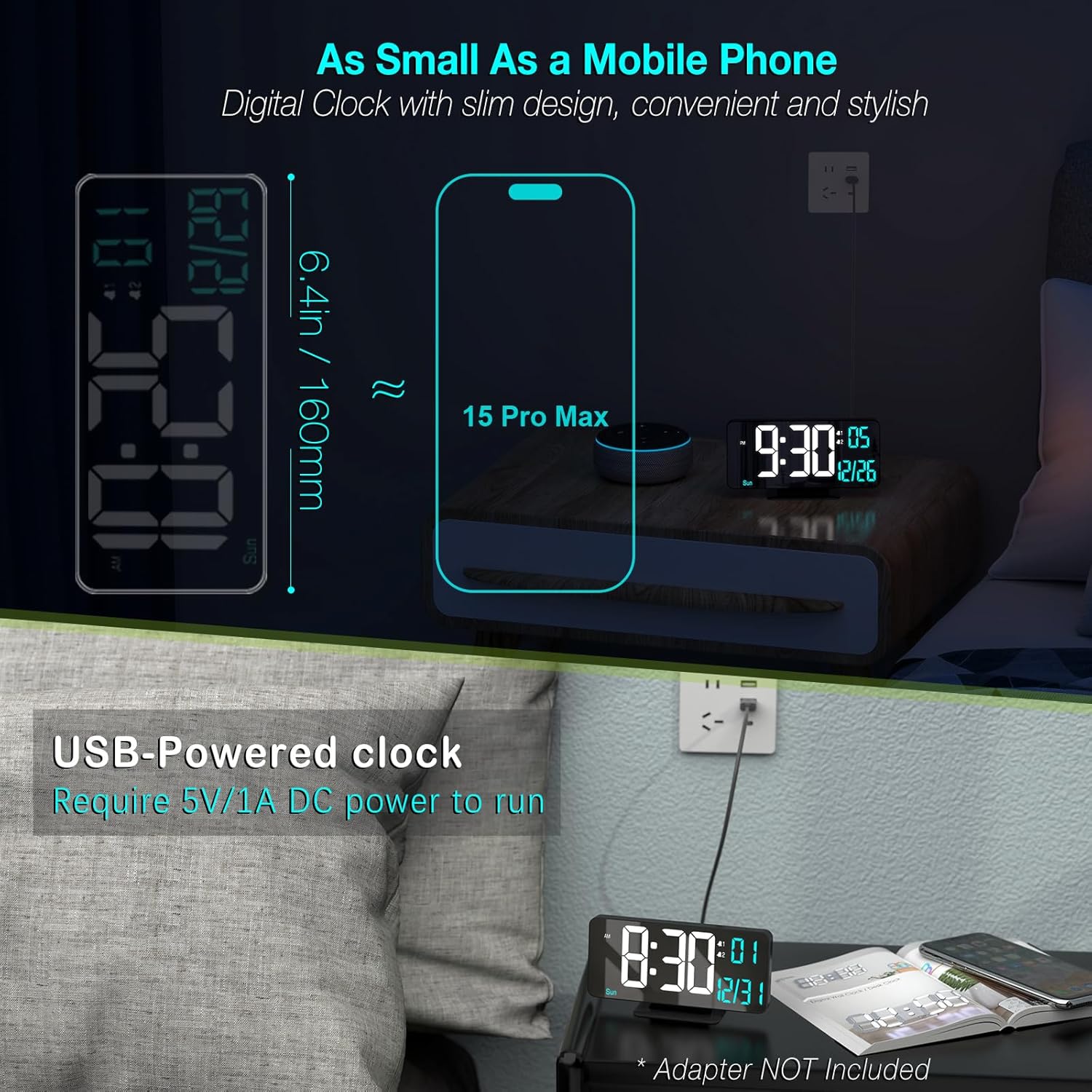 - [6.7in Black Digital Clock] The black alarm clock features 6.7-inch LED light display with a sleek mirror clock style, which has dual alarms,12/24-hour format, date, day of week, seconds, temperature (β / β), and auto/manual dimming, it is also a stylish and modern digital calendar for room accessories. Additionally, the bright big white and sky blue digits make the desk clock cool and easy-to-read.